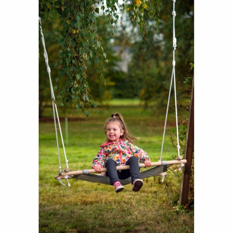 Táto skvelá hojdačka urobí radosť každému dieťaťu. Zavesíte ju na strom alebo stojan vo vašej záhrade pomocou dvoch lán. Má drevený rám, vnútorná časť je z pogumovanej textílie, ktorá zaručuje odolnosť voči počasiu.