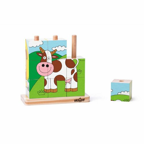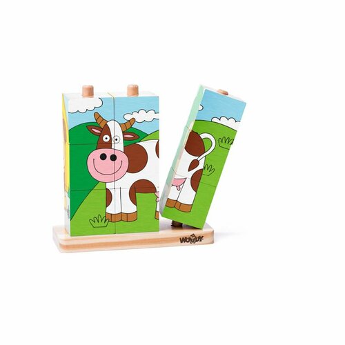 Klasický detský kubus tvorený kockami s obrázkami má navyše funkciu, kedy dieťa navlieka kocky na tyčky. Obrázky a dizajn k tomuto výrobku pochádza z dielne českého návrhára. Tyčky majú bezpečnostnú funkciu a v prípade pádu dieťaťa na tyčku sa ohnú. Veľkosť kocky: 4,5 cm.