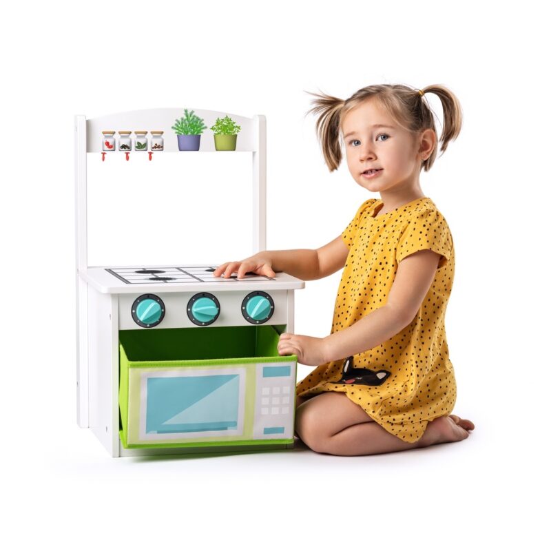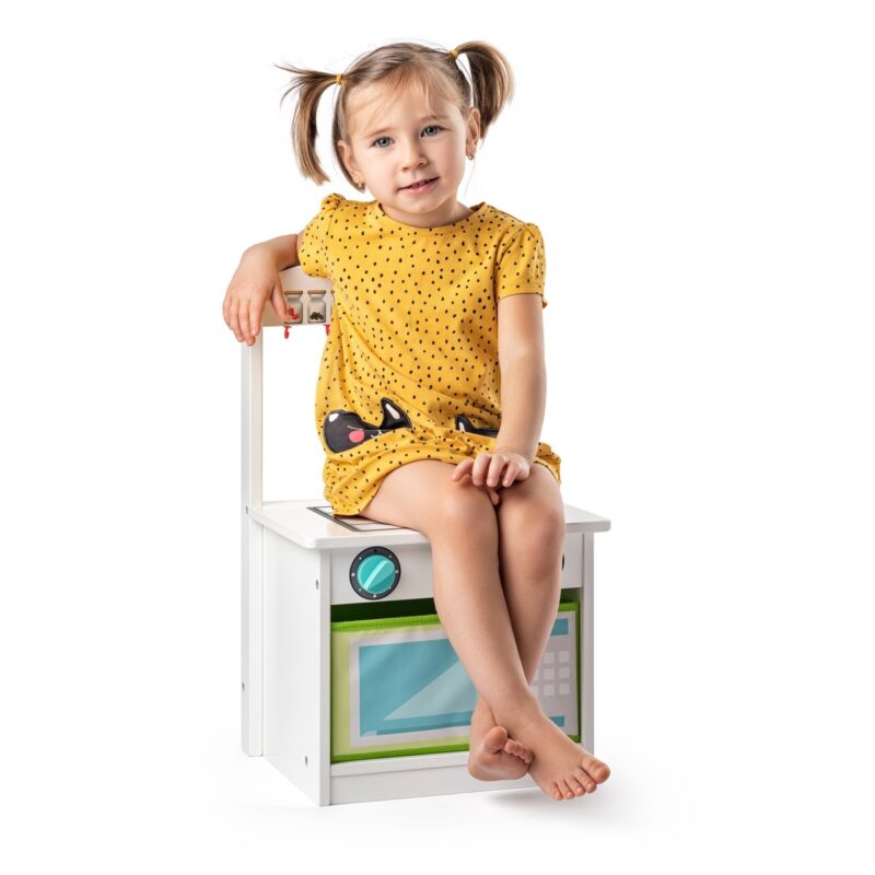 Táto krásna kuchynka má otočné gombíky a ďalšie kúzelné detaily, ako je sporák, rúra alebo namaľované koreničky a kvetinky. Časť s rúrou je úložným boxom, kam si môže vaša ratolesť uložiť napríklad kuchynské náčinie. Zároveň je aj detskou stoličkou, skvele teda poslúži napríklad u detského stola.