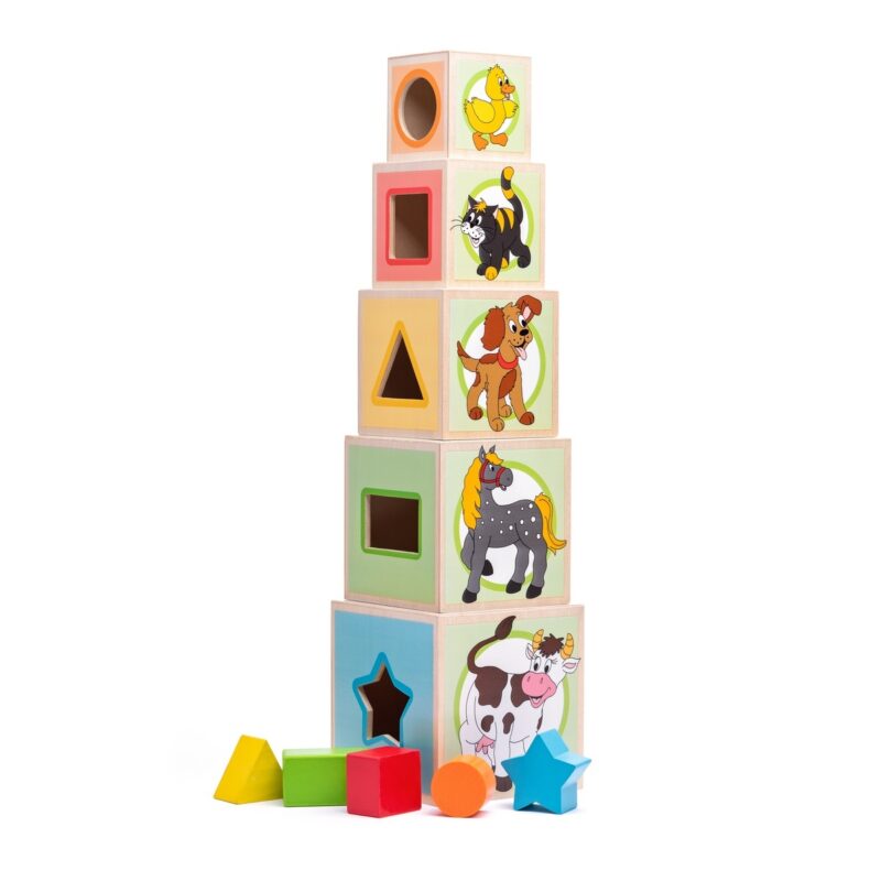 S touto hračkou sa vaše deti ľahko zabavia. Päť kociek, ktoré sa dajú skladať na seba i do seba má niekoľko funkcií. Každá má na jednej strane vyrezaný otvor, do ktorého sa vkladá kostička príslušného tvaru a farby. Na ďalších stenách sú obrázky s rôznym počtom zvieratiek, ktorý odpovedá číslici na vedľajšej strane kocky.