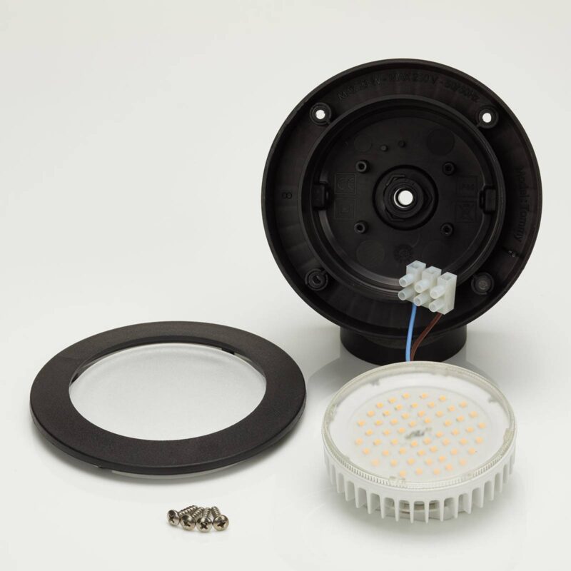 Čierne LED vonkajšie bodové svetlo Tommy na povrchovú montáž – vrátane výkonnej žiarovky s variabilnou farbou svetla Bodové svietidlo Tommy určené na montáž na stenu alebo podlahu má jednoduchý vzhľad, je úplne čierne a má okrúhlu hlavu. Jeho funkčnosť je však pôsobivá. Svetlo vyžarované matnou polykarbonátovou tabuľou možno nasmerovať na požadované miesto vďaka nastaviteľnému upevneniu. Okrem toho je farba svetla nastaviteľná v troch stupňoch; LED žiarovka GX53 má na tento účel malý spínač. Vďaka robustnému telu z liatej živice a silikónovým tesneniam nemôže vietor a počasie poškodiť zabudované bodové svetlo.