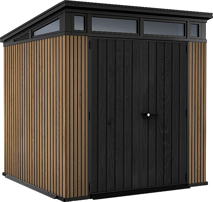Bezúdržbový domček je vyrobený z jedinečného materiálu DECOCOAT, ktorý je inšpirovaný moderným vzhľadom v imitácii dreva. Domček má robustnú konštrukciu s dvojitými stenami a kovové výstuhy. Je tiež vybavený pevnou dizajnovou strechou, širokými dvojitými dverami a podlahou na náročné použitie s nosnosťou 150 kg na m 2 . Domček je ideálny nielen na uschovávanie náradia a záhradných doplnkov, ale aj na kosačku alebo grill. Jeho hlavné výhody sú stabilná, spevnená oceľová konštrukcia, pevná strecha a široké dvojité dvere. Všetky domčeky Keter sú vybavené vysoko odolnou podlahou. Zaťaženie strechy až 150 kg/m 2 , odolnosť voči vetru do 145 km/hod (platí v prípade ukotvenia).