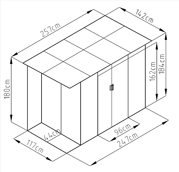 Výška steny 165cmVnútorné rozmery: 247x117x184cmRozmer dverí: 162x96cm