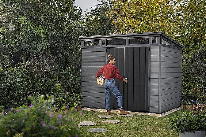 Domček je ideálny nielen na uschovávanie náradia a záhradných doplnkov, ale aj na kosačku alebo grill.