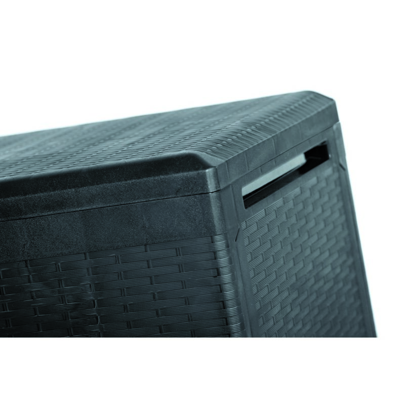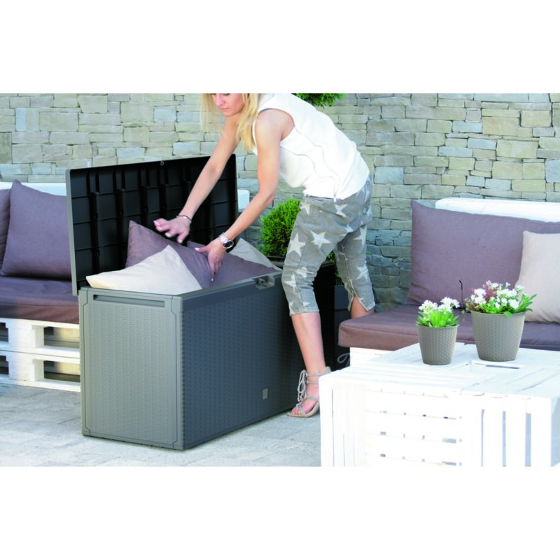 Objemný záhradný box vám pomôže ovládnuť každý neporiadok a vďaka kolieskam bude ľahko premiestniteľným pomocníkom. Box je ľahký, odvetraný a chráni uschované predmety pred náhlym dažďom.Ľahko v ňom uschováte vankúše zo záhradného nábytku, deky, záhradné potreby, menší nábytok alebo hračky pre deti. Vstavaný držiak s možnosťou uzamknutia vám dovolí zamknúť cennejšie veci vo vnútri.Bočné strany majú mozaikovú štruktúru a sú zdobené imitáciou ratanového výpletu.Kvalitný, bezúdržbový box je odolný voči atmosférickým vplyvom a nemusí sa nijako konzervovať. Jednotlivé časti boxu sa zacvaknú do seba, takže vám jeho zostavenie nezaberie veľa času.