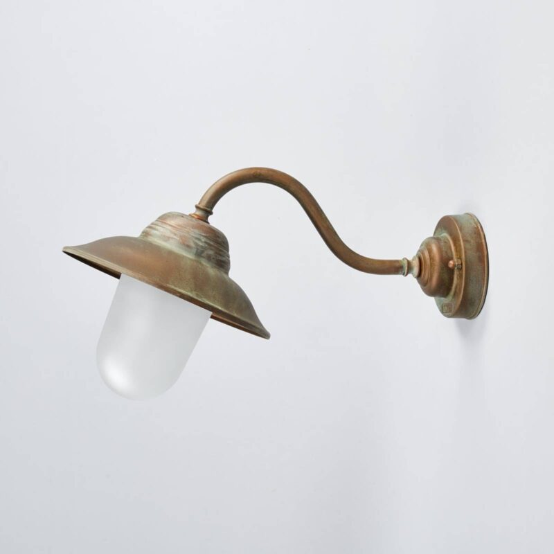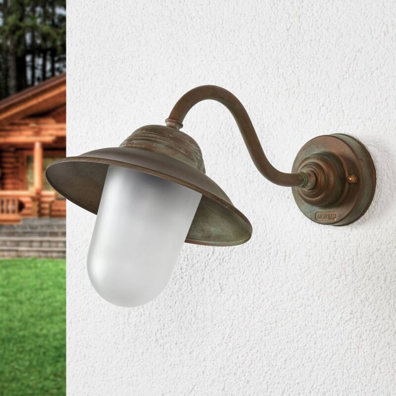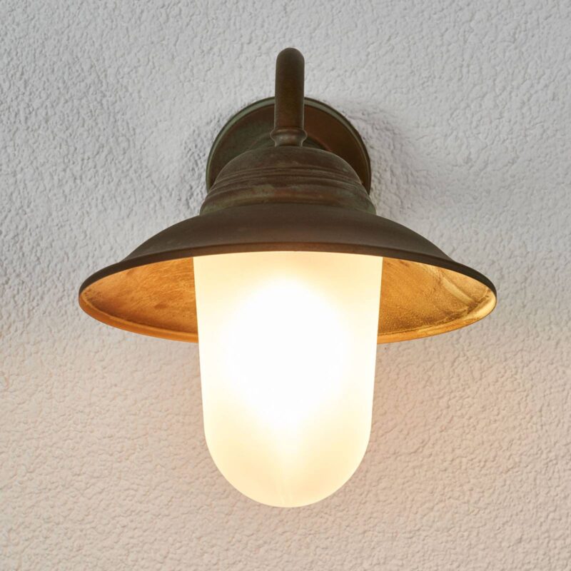 Vonkajšie nástenné svietidlo Birga s nádherne zakriveným mosadzným rámom Toto robustne spracované nástenné svietidlo s mosadzným rámom sa hodí najmä do prostredia v rustikálnom alebo starožitnom štýle. Veľké opálovo biele sklo lampy vyžaruje jasné svetlo na bezpečné okolité osvetlenie. Kov je chránený proti korózii spôsobenej morskou vodou, vďaka čomu je nástenné svietidlo Birga dobrou voľbou pre nehnuteľnosti v blízkosti pobrežia.