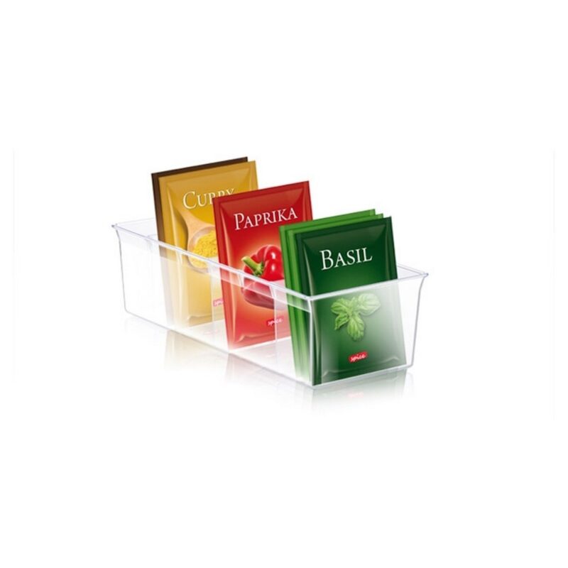 Zásobník na vrecká s korením 4FOOD značky Tescoma pre prehľadné skladovanie sáčkov s korením všetkých obvyklých veľkostí. Vybavené tromi nastaviteľnými prepážkami, vhodné do kuchynských skriniek bežných rozmerov. Vyrobené z odolného plastu, vhodné do umývačky riadu. 3 roky záruka.Rozmery: 29 x 11 x 8 cm