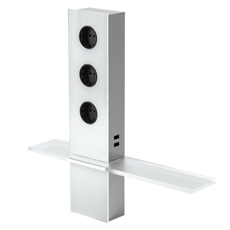 Dekoratívna a funkčná – zásuvková veža s ďalšími nabíjacími zásuvkami USB Okrem troch zásuviek má táto zásuvková veža na boku dve zásuvky USB a praktickú úložnú plochu zo skla hrubého 8 mm, na ktorú môžete smartfón pohodlne odložiť na nabíjanie. Táto ďalšia polica hrá tiež dôležitú úlohu v dizajne, pretože číre sklo v kombinácii s telom z brúsenej nehrdzavejúcej ocele robí zásuvkovú vežu úžasne elegantnou a dekoratívnou. Pre zariadenia do max. 3 500 W. 230 V / 16 A. – vyrobené v Nemecku