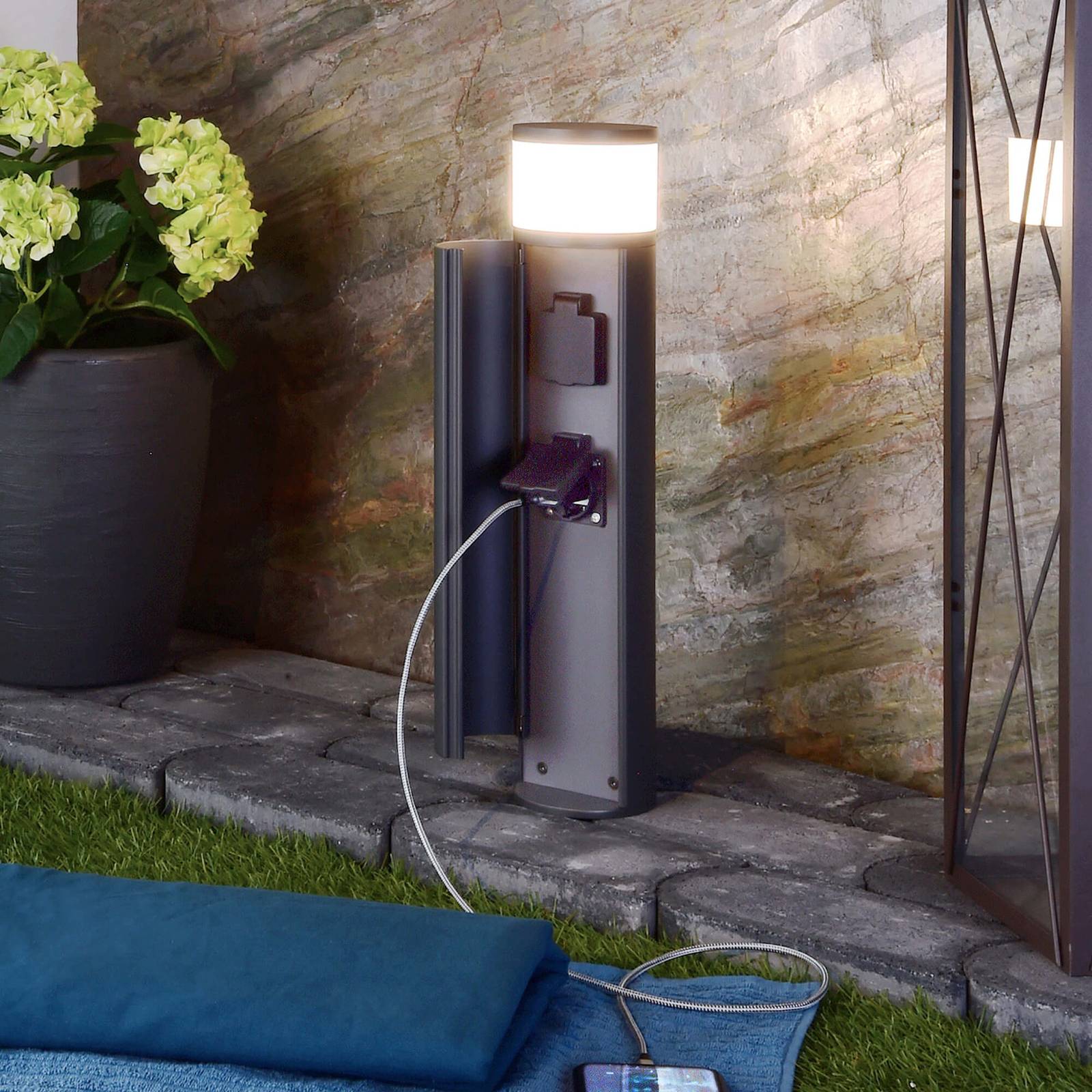 Valcový zásuvkový stĺp s krytím IP44 a integrovanými LED diódami Tento osvetlený zásuvkový stĺp má integrované LED diódy a zaujme svojím moderným dizajnom. Má elegantnú tmavosivú povrchovú úpravu a je vyrobený z liateho hliníka. Jeho dve zásuvky poskytujú maximálny výkon 3 650 W a vďaka stupňu krytia IP44 je univerzálny na vonkajšie použitie. Zásuvka svieti príjemným teplým bielym svetlom a osvetľuje všetko okolo.