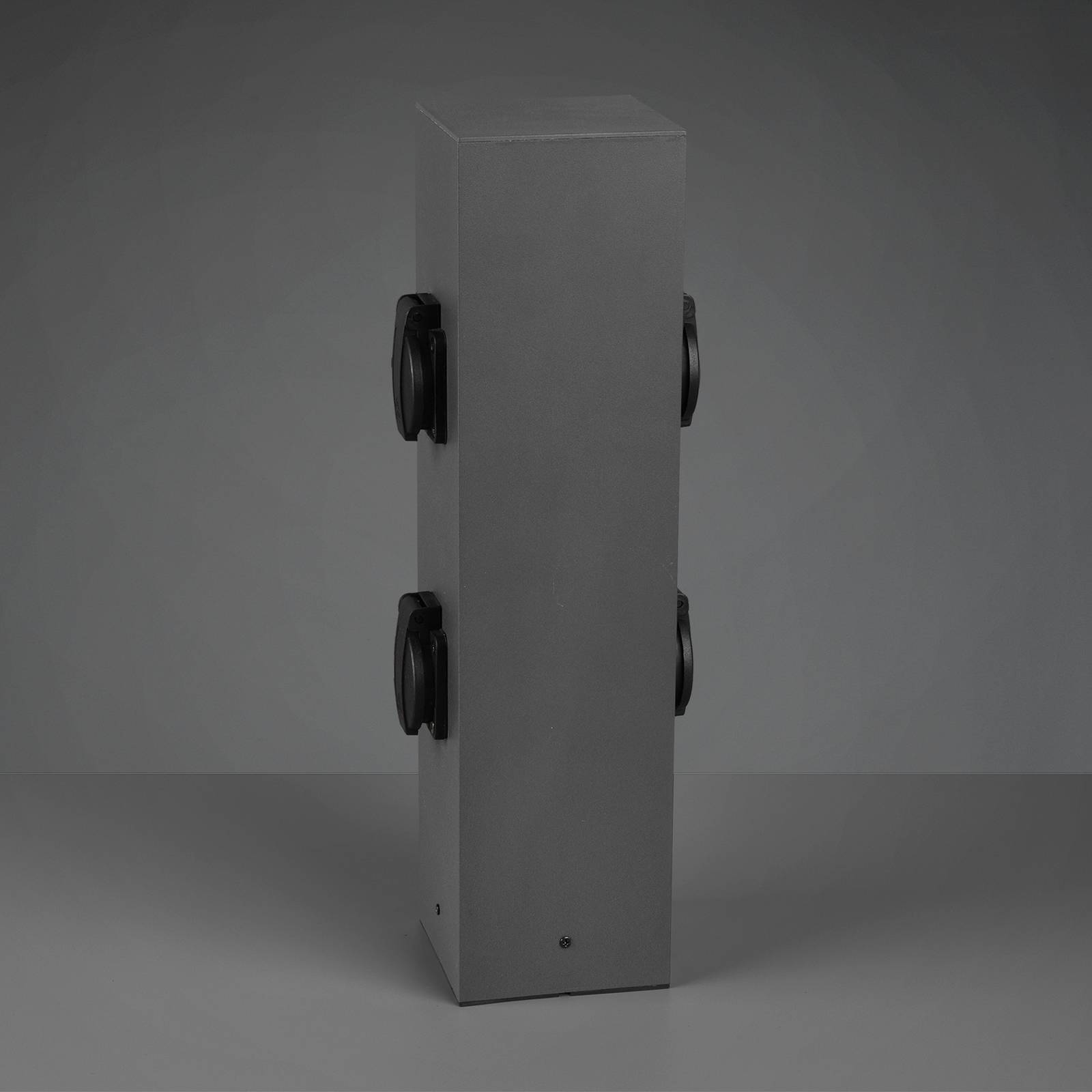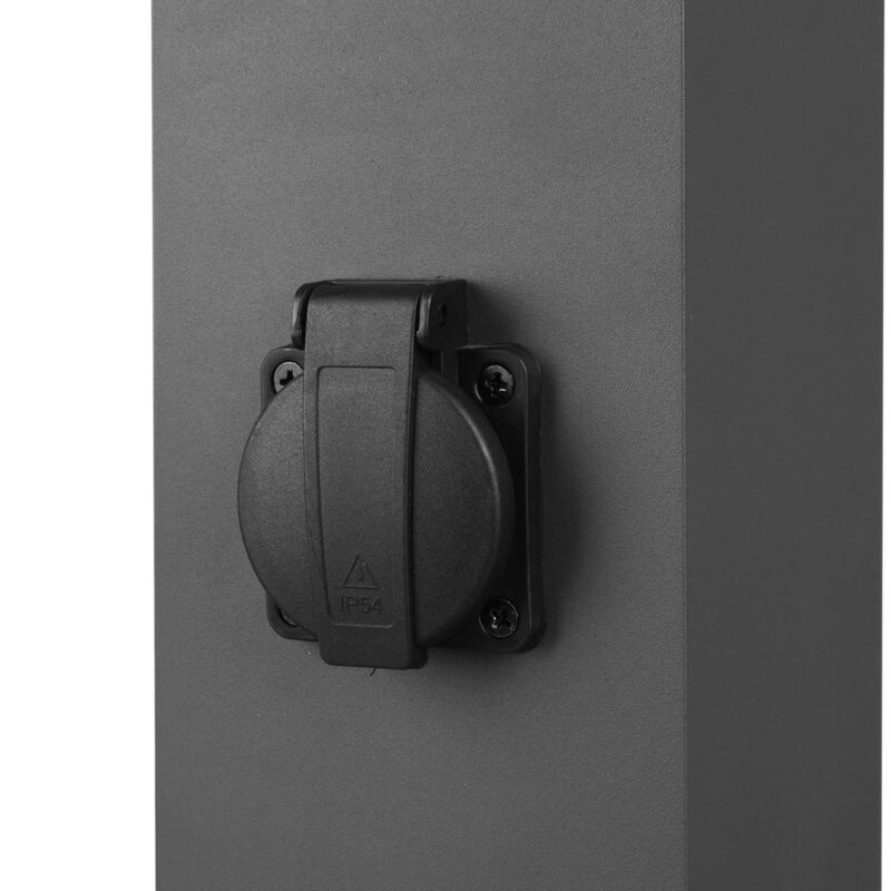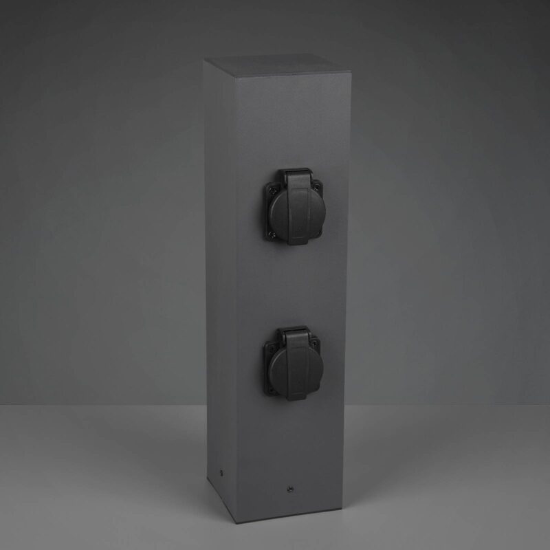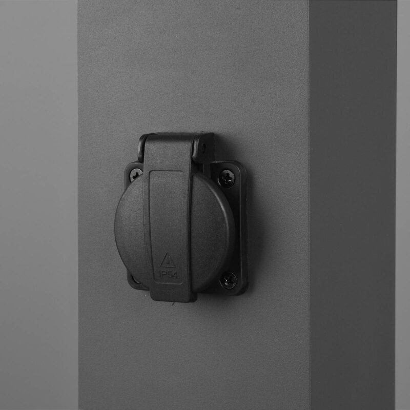 4-cestný zásuvkový stĺp Bollard na vonkajšie použitie Kovový zásuvkový stĺp Bollard má štyri zásuvky s ochrannými klapkami (2 x 2 na protiľahlých stranách) na napájanie elektricky ovládaných zariadení vo vonkajšom priestore. Stĺpik má vizuálne neutrálny kubický dizajn v tmavej antracitovej farbe – Trieda ochrany: IP44 – Maximálny celkový výkon prevádzkovaných záťaží: 3600 W, 16 A