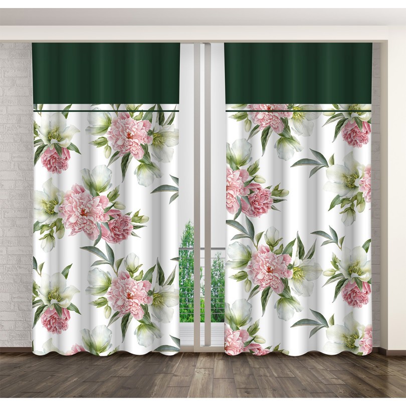 Záves s potlačou ružovo-bielych kvetín a zeleným lemom Dĺžka: 270 cm