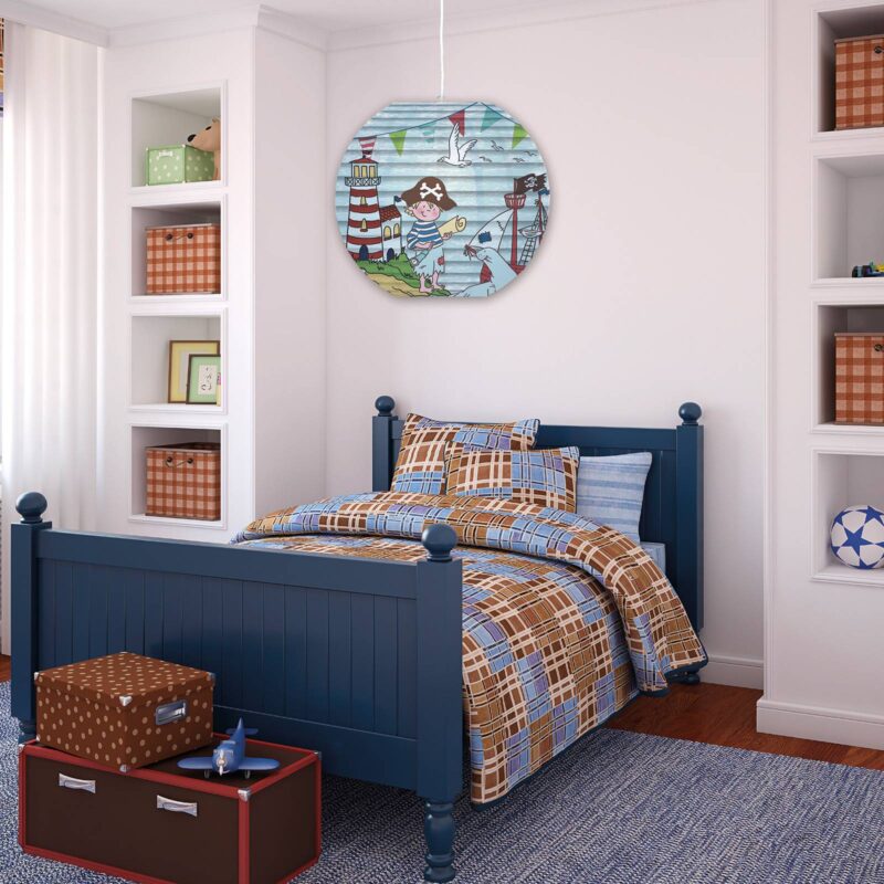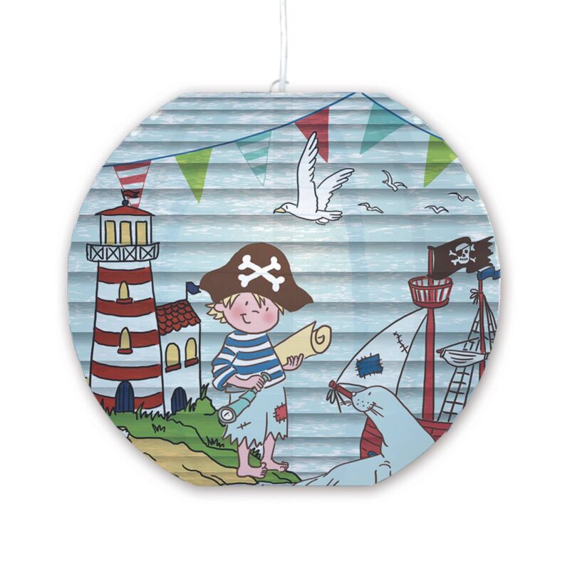 Závesné svietidlo Pirat 4120607 pre malých hľadačov pokladov Závesné svietidlo Pirate je ideálne pre malých dobrodruhov. Papierové tienidlo na lampu poskytuje mimoriadne teplé svetlo bez oslnenia, ale miestnosť je stále jasne osvetlená. Pretože je tienidlo na lampu mierne modrasté, vyžarované svetlo sa tiež trblieta na modro. Lampa ukazuje mladého piráta, ktorý sa vydáva na veľké dobrodružstvo. To stimuluje predstavivosť k snívaniu a pošle deti na hľadanie pokladov v detskej izbe doma.