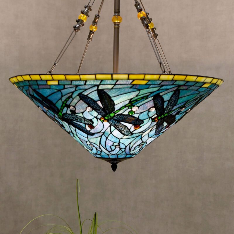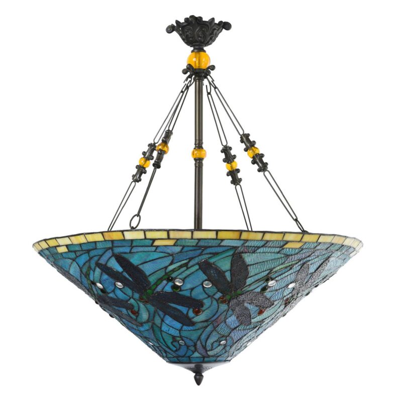 Závesné svietidlo 5975 s impozantným skleneným tienidlom v optike Tiffany Závesná lampa 5975 je vybavená nádherne navrhnutým skleneným tienidlom, ktoré pozostáva hlavne zo sklenených prvkov v rôznych odtieňoch modrej a na ktorých frflú milé vážky. Modrú uvoľňuje horný okraj kúskov žltého skla a jemné zelené detaily. Hneď ako sa rozsvieti svetlo, zvierací motív si príde na svoje. Rám je tiež atraktívne navrhnutý so závesnou tyčou v strede a dekoratívne zdobenými závesnými lanami, ktoré vedú z tienidlo na lampu k stropnej konzole a udržiavajú veľký tienidlo na lampu v rovnováhe.
