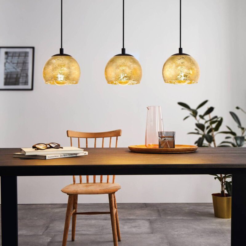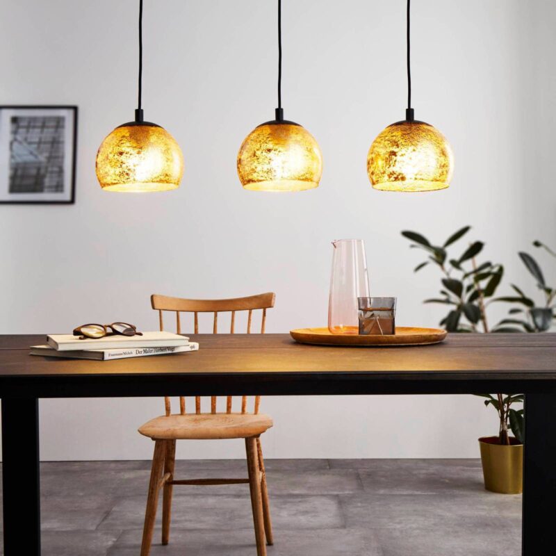 Závesné svetlo s 3 žiarovkami Albaraccin v čiernej farbe Závesné svietidlo Albaraccin zaujme jednoduchým, rovným oceľovým prvkom v čiernej farbe a tromi závesnými žiarovkami so zlatým skleneným tienidlom. Vďaka tomu sa harmonicky integruje do rôznych miestností a je obzvlášť pôsobivý nad jedálenským stolom. Svetlá sú pripevnené k kvalitnému oceľovému nosníku v rovnakej výške a rovnomerne rozmiestnené. Čierna farebná schéma a priame línie vytvárajú moderný a minimalistický vzhľad žiarovky. Zlaté sklo tienidiel naopak vytvára ušľachtilé akcenty a rozptyľuje teplé svetlo.