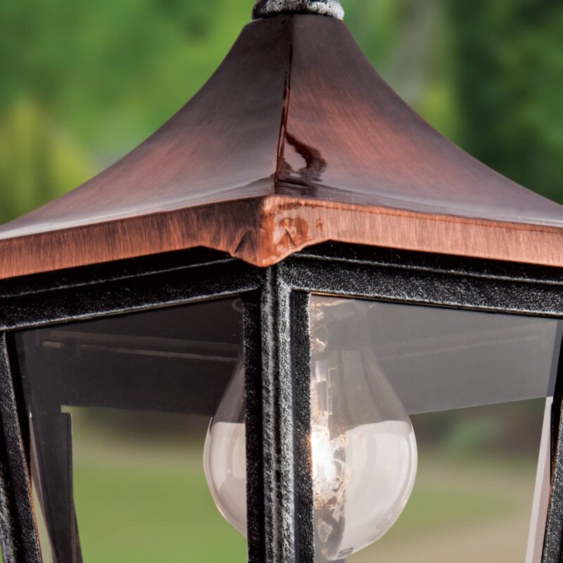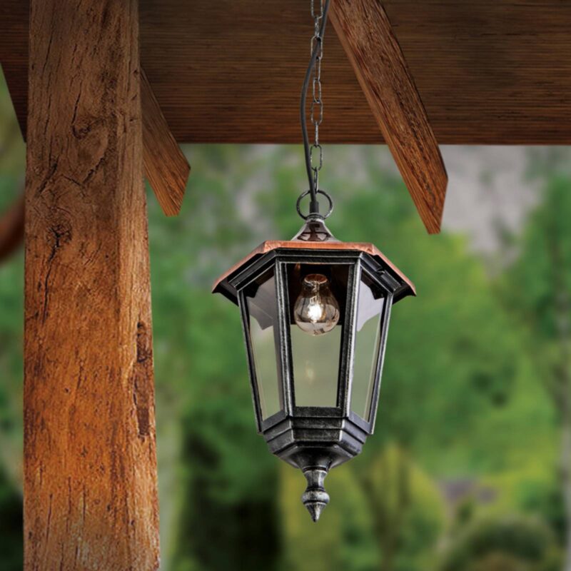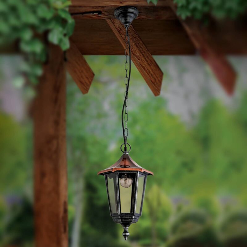 Exteriérové závesné svietidlo ANOTINE so starožitným šarmom Toto exteriérové závesné svietidlo zo série ANTOINE tvorí zaujímavá hliníková konštrukcia s čierno-sivým lakovaním. Toto pekne tvarované svietidlo je doplnené čírym sklom a na jeho vrchu je umiestnená medená strieška. Nostalgický šarm, staromódny tvar lampáša a vysoká svetelná efektivita robia zo svietidla ANTOINE perfektného spoločníka na terasách alebo balkónoch.