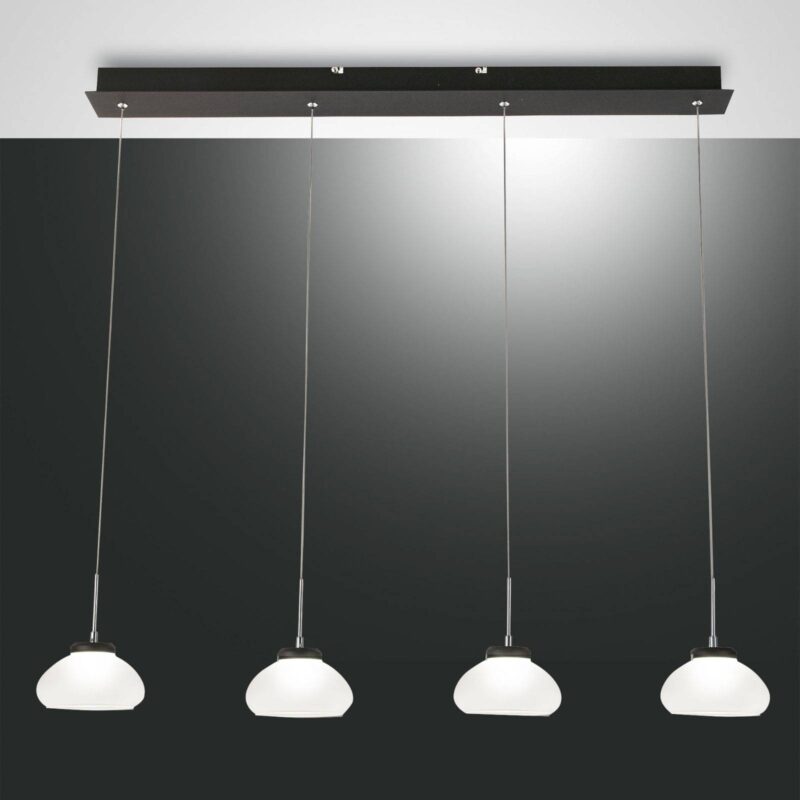 Stmievateľné LED závesné svietidlo Arabella so štyrmi sklenenými tienidlami v rade Závesné svietidlo Arabella je štýlovým a funkčne presvedčivým zdrojom svetla, predovšetkým nad obývacou izbou a jedálenskými stolmi v modernom obývacom priestore. Je vybavená štyrmi okrúhlymi sklenenými tienidlami, ktoré sú pravidelne zavesené vedľa seba na čiernom kovovom vrchlíku. Teplé biele svetlo je vyžarované priamo cez obrazovky, ktoré sú v spodnej časti otvorené, a dopadá cez bočnú časť skla ako základné osvetlenie do miestnosti. Počas montáže je možné dĺžku závesov skrátiť na požadovanú dĺžku. Svetelný výkon je možné regulovať pomocou externých stmievačov prednej a dolnej hrany.