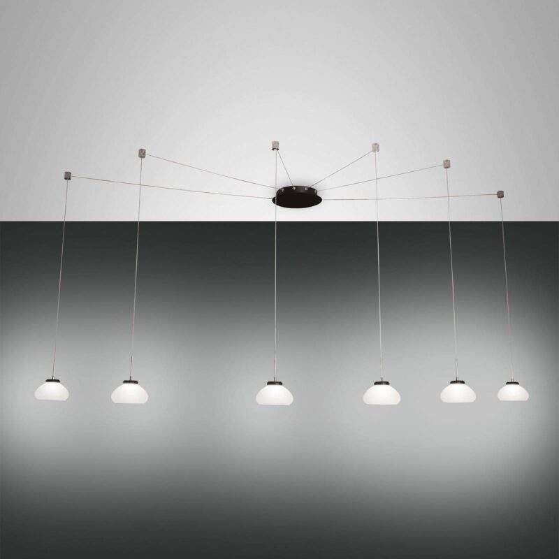 Závesné LED svietidlo Arabella so šiestimi žiarovkami a decentralizovanými závesmi LED závesné svietidlo Arabella sa vyznačuje šiestimi sklenenými tienidlami, ktoré zaisťujú rovnomerné osvetlenie miestnosti. Strieška má osem štrbín, aby bolo možné variabilne použiť svetelný kábel. Súčasťou dodávky je šesť deflektorov, ktoré umožňujú decentralizované zavesenie. Tienidlá sú vyrobené zo satinovaného skla, čo zaručuje vyžarovanie svetla bez oslnenia. Súčasne je možné LED diódy ovládať pomocou stmievačov s prednou alebo zadnou hranou, aby bolo možné okrem jasného osvetlenia miestnosti vytvoriť aj útulnú atmosféru. Táto moderná lampa si nájde ideálne miesto v obývacej alebo jedálenskej časti.