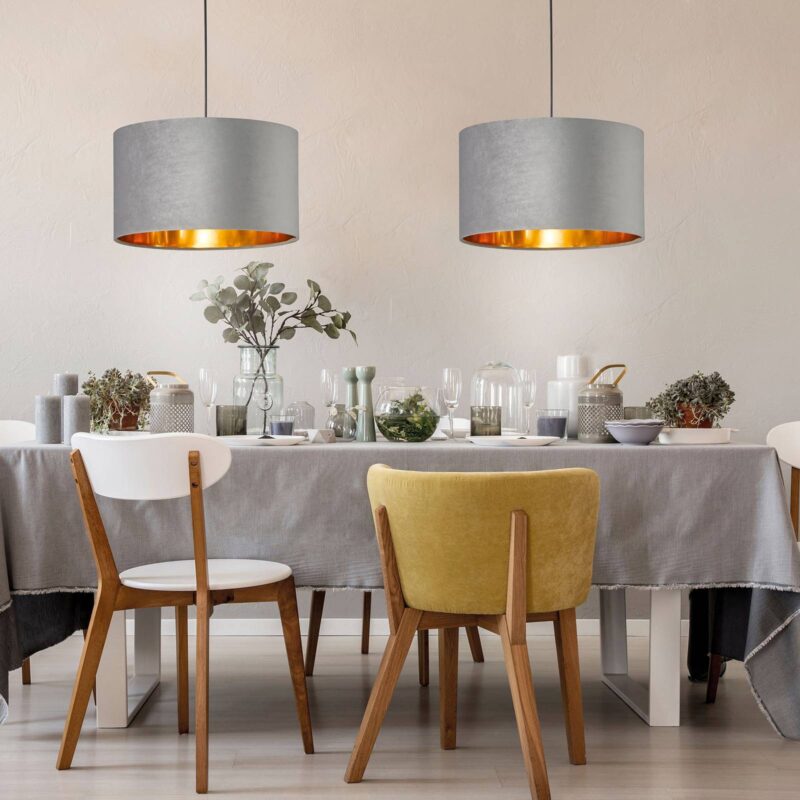 Elegantné závesné svietidlo Aura s útulným svetelným efektom Závesná lampa Aura sa dá veľmi dobre použiť na osvetlenie stola. Veľká časť svetla uniká smerom hore a dole, pretože textilný tieň vyrobený zo zamatu je nepriehľadný, a preto umožňuje úniku malého množstva svetla všade naokolo. Na vnútornej strane tienidla je navyše zlatý povrch, ktorý vytvára nádherné odlesky teplého svetla. To zaisťuje, že svetelný efekt je vnímaný ako obzvlášť útulný. Aura je skutočným pútačom pozornosti v obývacej a jedálenskej časti.