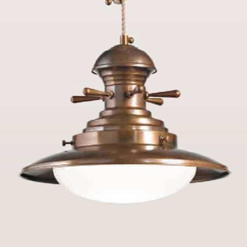Námorná závesná lampa Baia z mosadzeKapitán Ahoj! Nádherná závesná lampa Baia vás pozýva snívať o šírom mori a plachetniciach na obzore. Je navrhnuté so široko otvoreným tienidlom z mosadze a krásnym telom lampy z bieleho matného skla. Okolo objímky má malý ornament, ktorý pripomína kormidlo. Na závese visí malá kotva, ktorá vyvoláva predstavu plachetnice. Námorné svietidlo vyžaruje jasné svetlo a poskytuje dobré a neoslňujúce osvetlenie miestnosti. Svojím atmosférickým vzhľadom môže Baia prispieť k atmosférickému štýlu bývania a je vhodné aj na použitie v gastronómii s námornou a rybárskou romantikou. Závesné svietidlo Baia je ručne vyrobené a pochádza od výrobcu osvetlenia v Taliansku. Jej výroba vychádza z tradičného umenia osvetlenia v Benátkach.