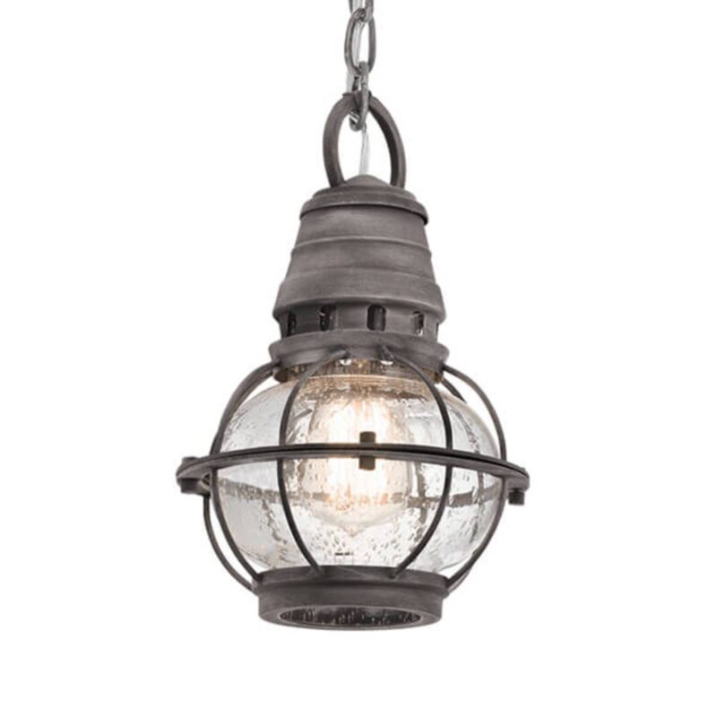 Vonkajšie závesné svietidlo Bridge Point v starožitnom priemyselnom dizajne Dizajnové modely krásneho vonkajšieho závesného svetla Bridge Point s baňatým sklom boli tradičné námorné a železničné tienidlo na lampu . Rám a ochranná sklenená klietka majú rustikálnu povrchovú úpravu so zvetraným zinkovým vzhľadom, rovnako ako zavesenie reťaze a vrchlík. Číre tienidlo na lampu je priehľadné a jemne štruktúrované, čo vytvára obzvlášť atmosférický svetelný efekt. Závesné svietidlo Bridge Point predstavuje štýlové vylepšenie osvetlenia zastrešených vonkajších priestorov.