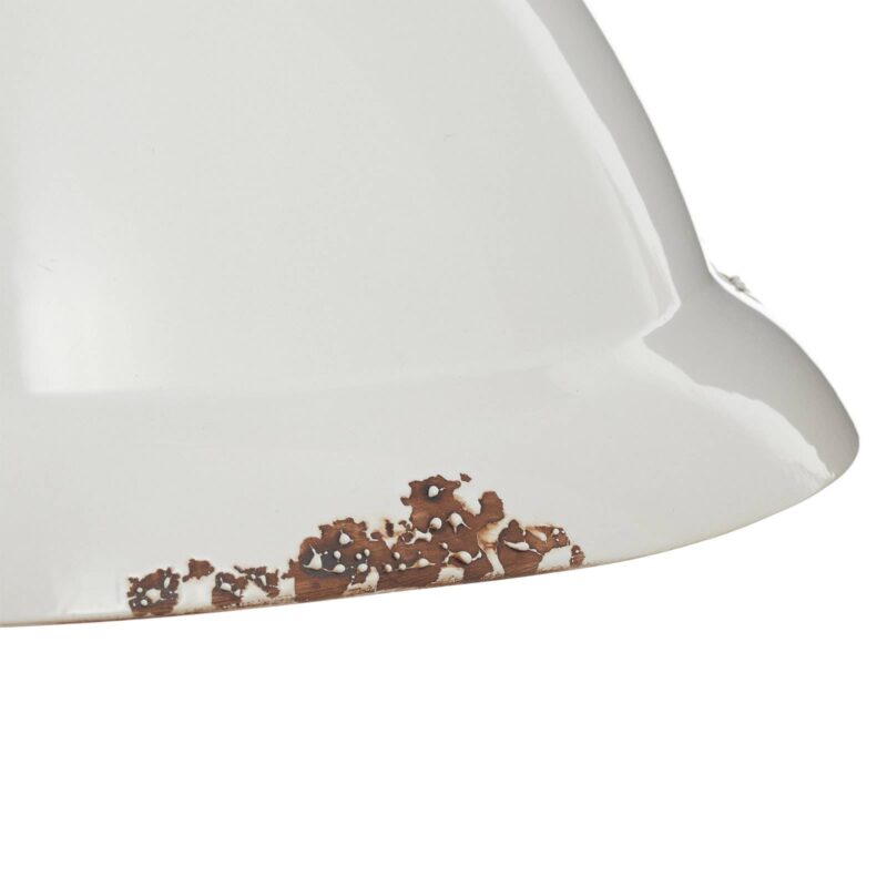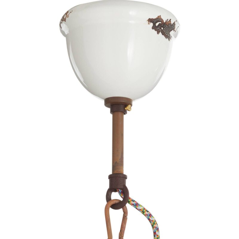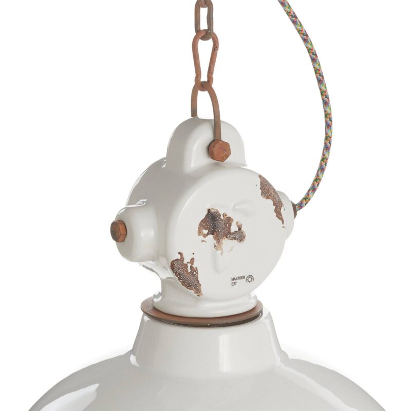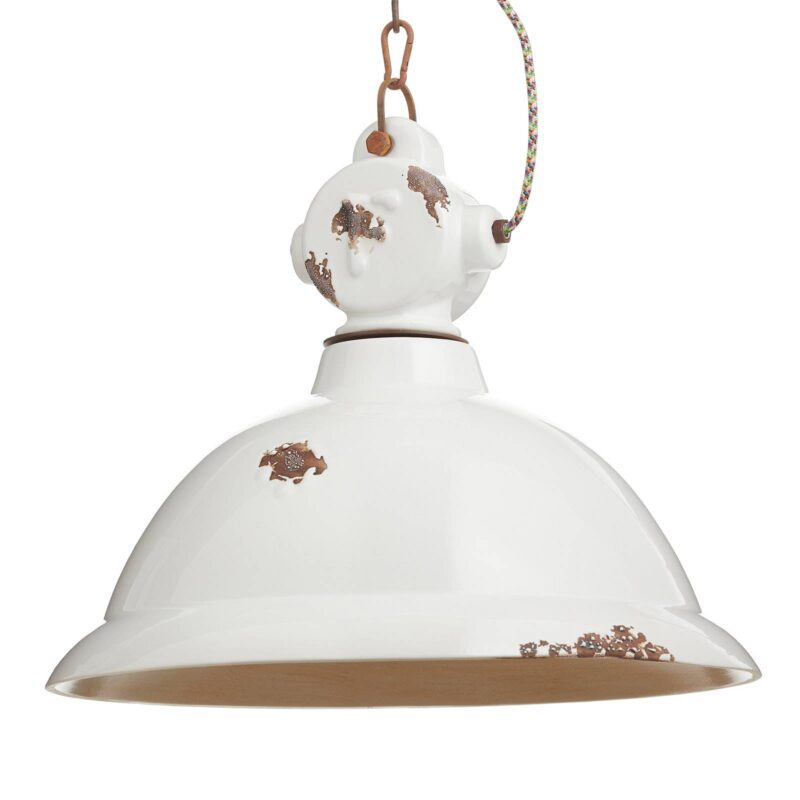 Staré priemyselné závesné svietidlo C1710 vyrobené z keramiky Zdá sa, že toto závesné svietidlo bolo prevzaté priamo zo starej dielne alebo továrne a vďaka priemyselným vplyvom a retro vkusu sa stáva štýlovým pútačom pozornosti v obývacej izbe alebo v bare. Hrdzavohnedá kovová retiazka drží veľký kupolovitý tienidlo na lampu vyrobený z keramiky s jednofarebným lakovým povlakom. Cielená nerovnomerná aplikácia vytvára dojem známok opotrebenia. Horná časť tienidla, ktorá slúži ako držiak reťaze a kábla, má veľké „F“, čo je skratka pre talianskeho výrobcu svetla Ferroluce . – ručne vyrobené v Taliansku