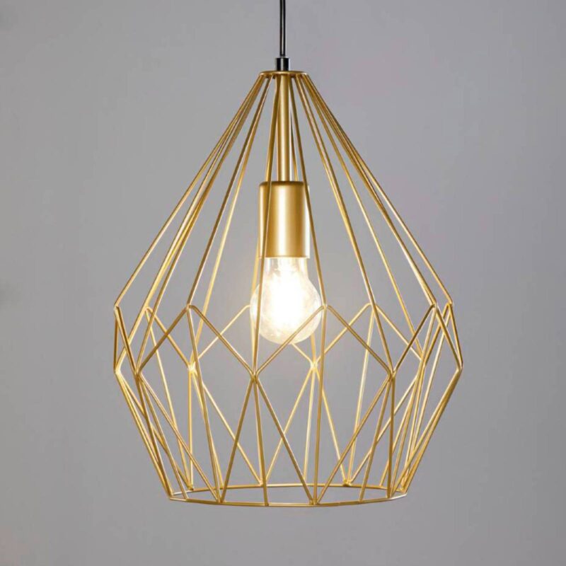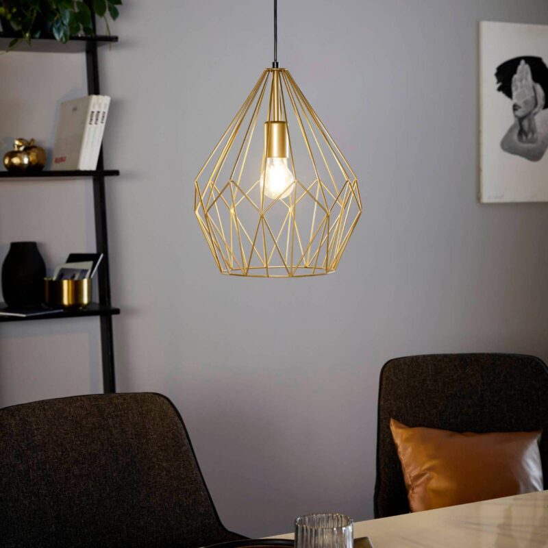 Závesné svietidlo Carlton v zlatej farbe s otvoreným tienidlom v klietke Kovové časti závesného svietidla Carlton boli nalakované ušľachtilým zlatým odtieňom, ktorý dodáva svietidlu nádych exkluzivity. Otvorené tienidlo svietidla pripomínajúce klietku pozostáva z jemných kovových vzpier, ktoré sú spojené do grafickej štruktúry. Závesné svietidlo nad stolom v obývačke, jedálni alebo aj v kuchyni nielen dobre vyzerá, ale poskytuje aj všestranné všeobecné osvetlenie. Vyzerá mimoriadne dekoratívne so žiarovkou v tvare gule a so vzhľadom vlákna.
