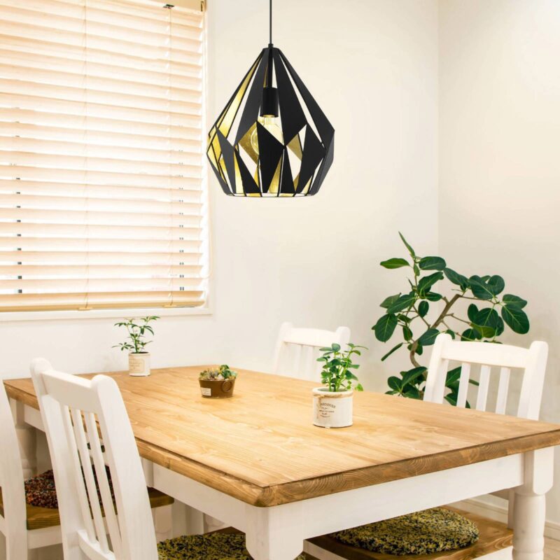 Extravagantná závesná lampa Carlton v čiernej farbe Extravagantný dizajn tejto závesnej lampy Carlton vo vintage štýle poskytuje okrem atraktívneho vzhľadu aj špeciálny dizajn osvetlenia. Na otvorenom tienidle sa geometrické obrazce – zlaté z vnútornej strany a čierne z vonkajšej – spájajú do kosoštvorca. Zdroj svetla (nie je súčasťou dodávky) zostáva viditeľný cez medzery. Ak sa používa stmievateľná žiarovka, svietidlo sa dá tiež stmievať. Týmto spôsobom možno vytvoriť individuálne osvetlenie miestnosti. Okrem toho integrované tvary lampy vytvárajú v miestnosti meniace sa hry svetla a tieňa. Vďaka tomuto efektívnemu svetelnému vzoru je závesné svietidlo Carlton vhodné napríklad do obývačky alebo spálne. Môže byť vybavený LED alebo úspornými žiarovkami.