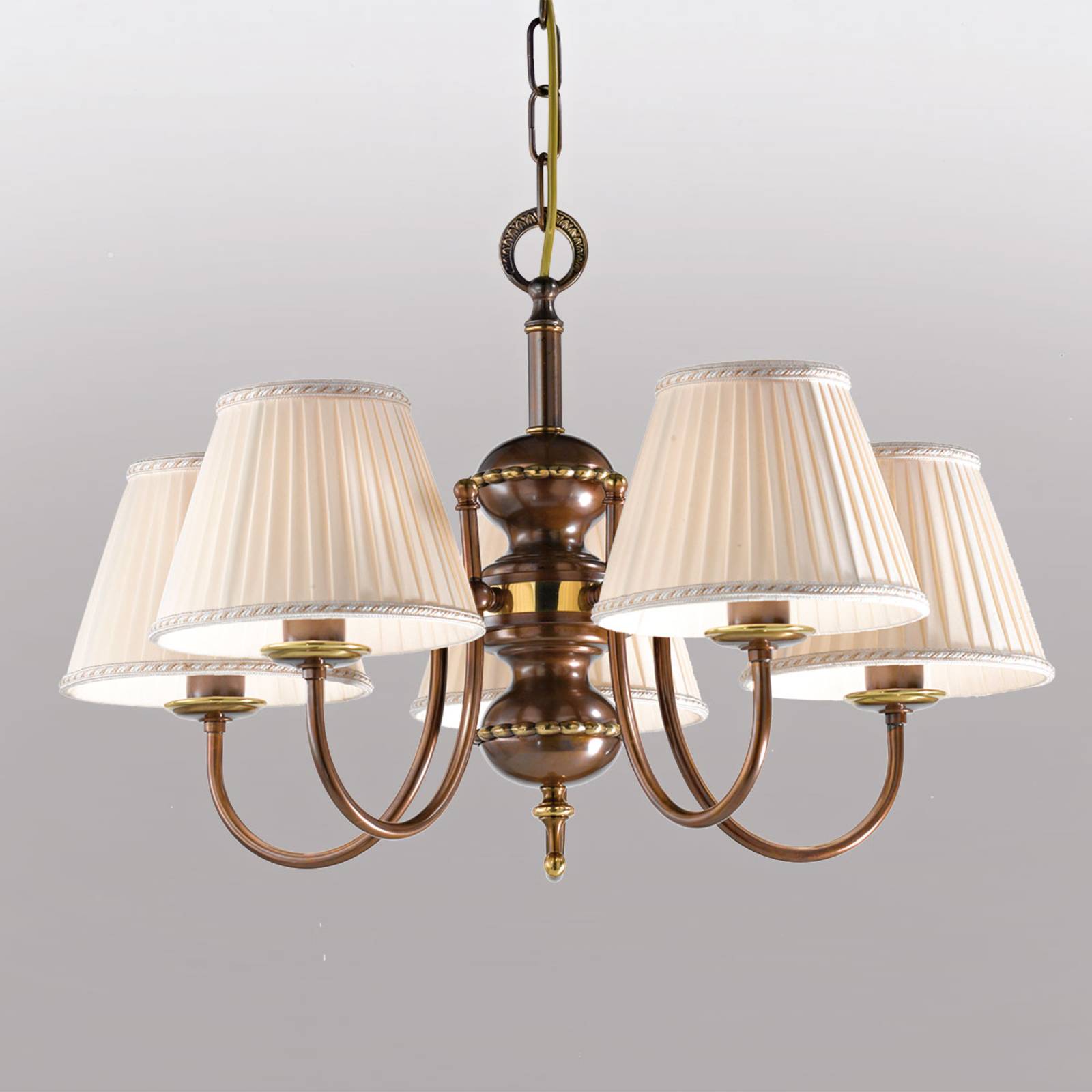 Nadčasovo navrhnuté závesné svietidlo Classic s piatimi plisovanými tienidlamiElegantné závesné svietidlo Classic s piatimi lampami prináša do obývačky atmosféru a štýl. Telo lampy je starostlivo vyrobené zo starožitnej mosadze. Rám svietidla s okrúhlym a elegantným tvarom je pripevnený k závesnej reťazi. Na zakrivených ramenách svietidla sú vidieť jemné línie. Päť nádherných tienidiel z vkusnej plisovanej látky korunuje klasickú kompozíciu. Látka vo farbe slonovej kosti a s jemným plisovaním poteší očarujúcimi ozdobnými okrajmi na okrajoch. Classic tak dodáva obývacej izbe dôstojnú a štýlovú atmosféru, ako aj neoslňujúce a atmosférické celoplošné osvetlenie. Vynikajúce svietidlo pochádza z talianskej výroby. Je ručne vyrobené z vysokokvalitných materiálov. Výrobca nadväzuje na benátsku tradíciu v konštrukcii svietidiel a dbá na výraznú starostlivosť a zmysel pre detail. Závesné svietidlo je výrobkom prvotriednej kvality.