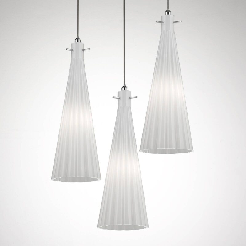 Závesné svietidlo Costa Rica – vyrobené v Taliansku Závesné svietidlo Costa Rica z Talianska upúta pozornosť každého a vytvorí štýlovú atmosféru, či už sa nachádza nad jedálenským stolom alebo pultom. Svietidlo pozostáva z troch lievikovitých tienidiel z ručne fúkaného skla. Sklo blokuje svetlo zo žiaroviek a svojou rebrovanou štruktúrou vytvára príťažlivú hru svetla. Tienidlá sú pripevnené ku kruhovému kovovému vrchnáku a visia v rôznych výškach, čím závesnému svietidlu dodávajú zaujímavú asymetriu. Poznámka: Svetelné zdroje sú viditeľné cez sklo, preto sa tu odporúča vizuálne atraktívny model.