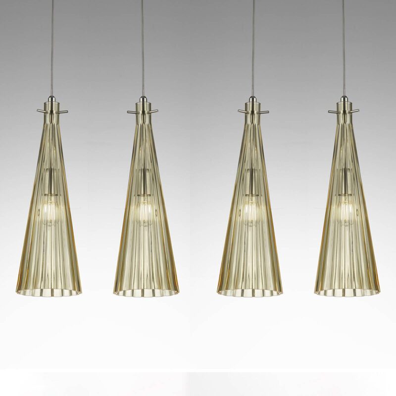 Taliansky dizajn – závesné svietidlo Costa Rica so štyrmi sklenenými tienidlami Závesné svietidlo Costa Rica talianskej výroby je vybavené štyrmi sklenenými tienidlami, ktoré majú tvar lievikov a rebrovanú štruktúru. Sklo tienidiel je fúkané ústami, a preto má sotva badateľné odchýlky, vďaka čomu je každé tienidlo takpovediac jedinečné. Tienidlá visia v rade od stropu a sú pripevnené k 1 m dlhému kovovému vrchlíku. Sklo blokuje svetlo zo žiaroviek a rovnomerne ho rozvádza do okolia, čím vytvára v miestnosti príjemnú a útulnú atmosféru. Poznámka: Žiarovky sú viditeľné cez sklo, preto sa tu odporúča vizuálne atraktívny model.