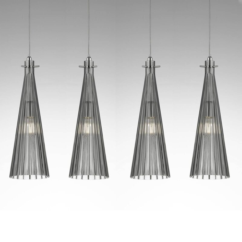 Taliansky dizajn – závesné svietidlo Costa Rica so štyrmi sklenenými tienidlami Závesné svietidlo Costa Rica talianskej výroby je vybavené štyrmi sklenenými tienidlami, ktoré majú tvar lievikov a rebrovanú štruktúru. Sklo tienidiel je fúkané ústami, a preto má sotva badateľné odchýlky, vďaka čomu je každé tienidlo takpovediac jedinečné. Tienidlá visia v rade od stropu a sú pripevnené k 1 m dlhému kovovému vrchlíku. Sklo blokuje svetlo zo žiaroviek a rovnomerne ho rozvádza do okolia, čím vytvára v miestnosti príjemnú a útulnú atmosféru. Poznámka: Žiarovky sú viditeľné cez sklo, preto sa tu odporúča vizuálne atraktívny model.