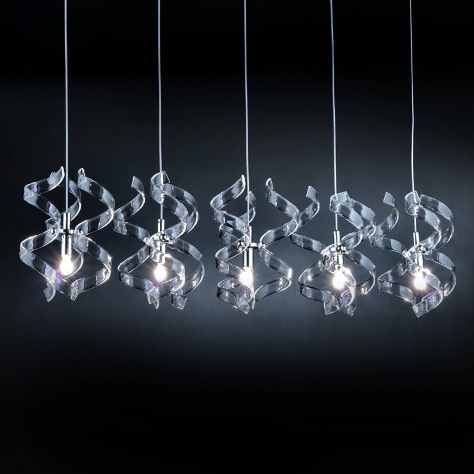 Veľkolepá závesná lampa Crystal s chrómovým držiakom Závesné svietidlo Crystal zaujme veľkorysým osvetlením, pretože päť zásuviek smerujúcich nadol je obmedzených len sklenenými dekoratívnymi prvkami. Kompozícia priehľadnosti a chrómu mimoriadne dobre zapadá do moderného a minimalistického štýlu. Dekoratívne prvky zo zakriveného skla okolo svietidiel majú reflexný aj lámavý účinok a inšpirujú aj svojím extravagantným tvarom.