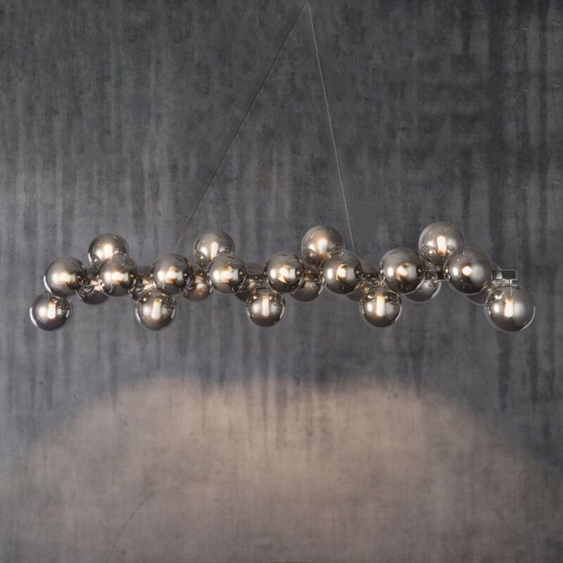 Závesné svietidlo Dallas s chrómovými sférickými sklamiZávesné svietidlo Dallas s 25 svetlami sa prezentuje ako sen: jeho podlhovasté tienidlo pozostáva zo sférických skiel s chrómovým odtieňom pripevnených k dlhej kovovej tyči. Celé svietidlo pôsobí moderne a zároveň veľmi slávnostne, pretože podsvietené sklá vyžarujú vďaka svojmu odtieňu mimoriadne žiarivé svetlo. pútavé základné a plošné osvetlenie pre moderný obývací priestor, ktoré dodá každej miestnosti osobitnú exkluzivitu.