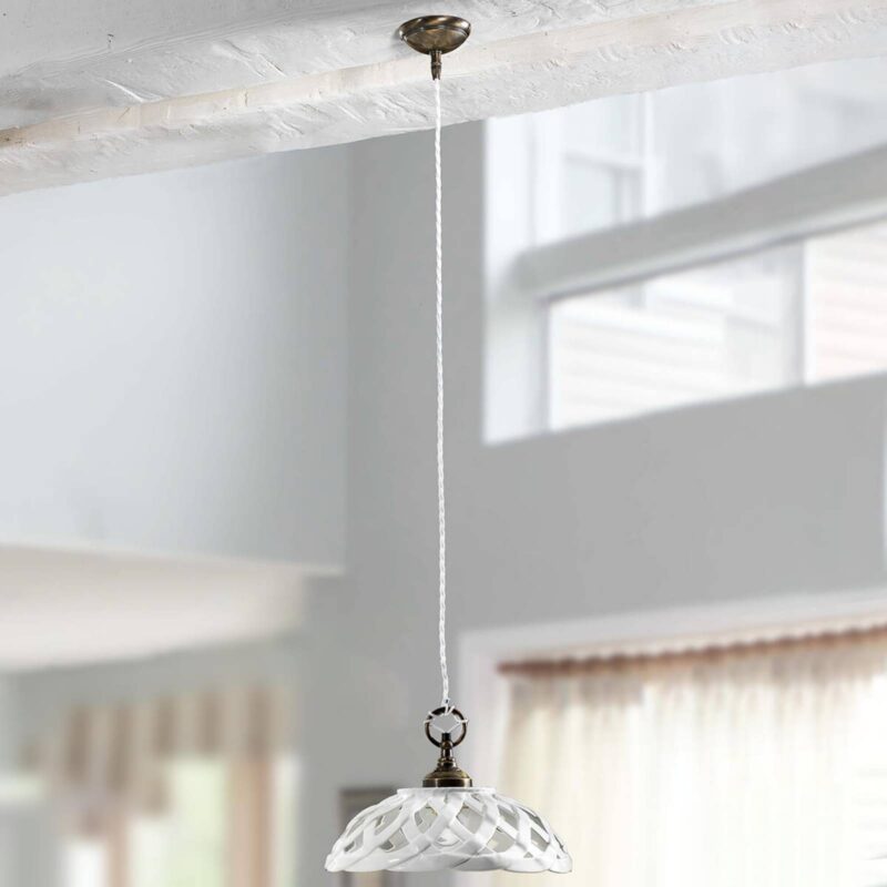 Emanuel – štýlová keramická závesná lampa v bielej farbeKeramická závesná lampa Emanuel vyžaruje rustikálny šarm. Pletené biele keramické tienidlo ideálne dopĺňa stropné svietidlo zo starožitnej mosadze. Otvory v tienidle, ktoré sú vytvorené vďaka pletenej konštrukcii, poskytujú krásne hry svetla a tieňa. Emanuel sa určite stane nadčasovým pútačom pozornosti v kuchyni alebo nad jedálenským stolom.