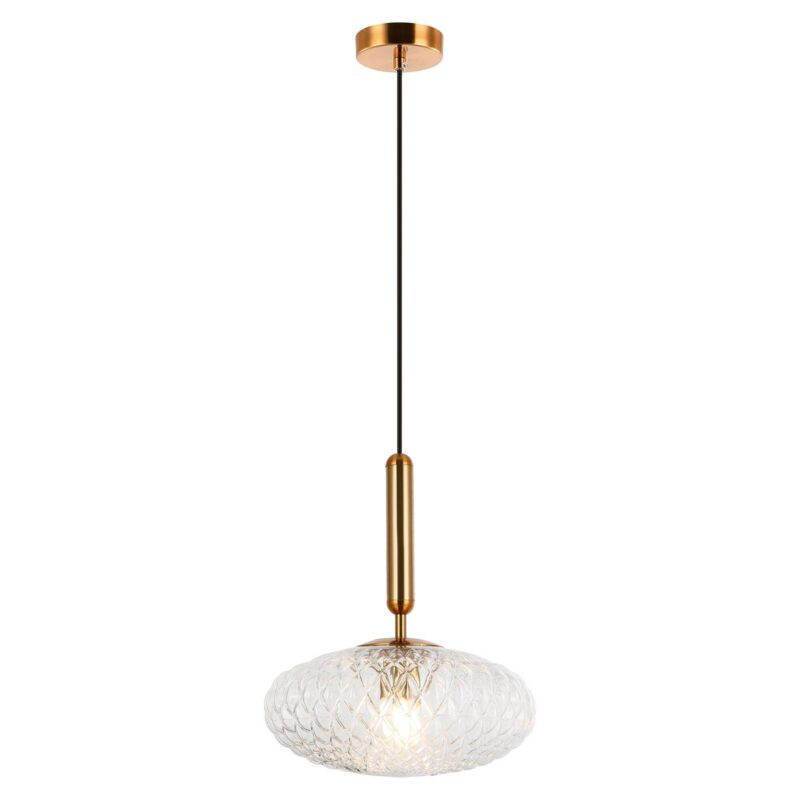 Závesné svietidlo Ester so vzorovaným skleneným tienidlom Táto závesná lampa vyzerá vďaka sklenenému tienidlo na lampu ľahko a elegantne. Drážky, ktoré vytvárajú na tienidlo na lampu zaujímavý vzor, zaisťujú fascinujúce vyžarovanie svetla. Exkluzivitu žiarovky zdôrazňujú vedomé detaily. Telo v tvare tyče z atraktívneho zlata tesne pred tienidlo na lampu zaisťuje, že lampa upúta priamo oko. Tento tvar ladí s rovnako zlatým, okrúhlym stropným vrchlíkom, z ktorého vychádza jemný držiak v čiernom tóne. tienidlo na lampu má cibuľovitý, oválny tvar a úplne obklopuje použitý osvetľovací prostriedok. To umožňuje, aby svetelný lúč vyšiel na všetky strany a vytvoril atmosférickú atmosféru.