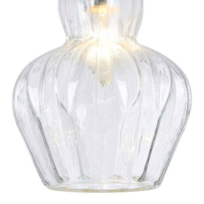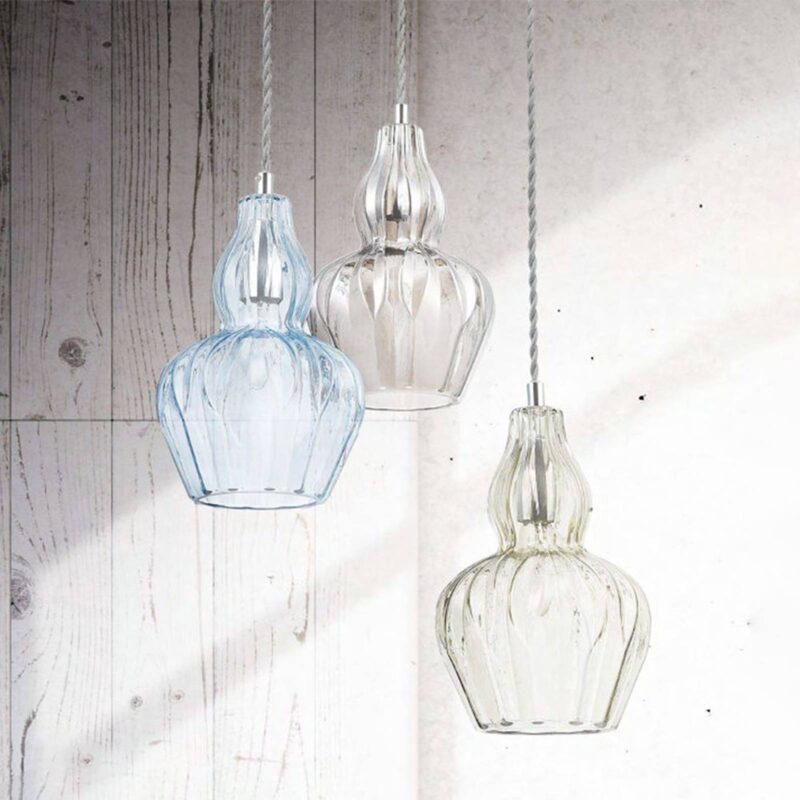 Závesné svietidlo Eustoma s dekoratívnym skleneným tienidlom Malá závesná lampa Eustoma, či už samostatne alebo dekoratívne v skupine, je svojím elegantným skleneným tienidlom skutočným pútačom pozornosti. tienidlo na lampu je vyrobené z brúseného skla – veľmi jednoduché, priehľadné a čírej farby. Svetlo tu jemne vyžaruje smerom dole a cez sklo do okolia, čím vytvára veľmi príjemné okolité a doplnkové svetlo, ktoré vyzerá skvele nad pultmi, stolmi, komodami alebo príborníkmi.