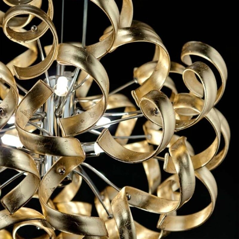 Závesné svietidlo GOLD – vhodné do luxusného životného prostredia Závesná lampa GOLD sa skladá z kovovej podstavy v strede chrómu: Z tejto Basis sa rozvetvujú kovové vzpery do všetkých strán, z ktorých koncov sa vinutie zlatých kovových prvkov spája a vytvára okrúhle telo žiarovky. Halogénové žiarovky svietia zo stredu prívesného svetla GOLD a dodávajú zlatému tónu zvláštny lesk. Žiarovky nie sú súčasťou dodávky.