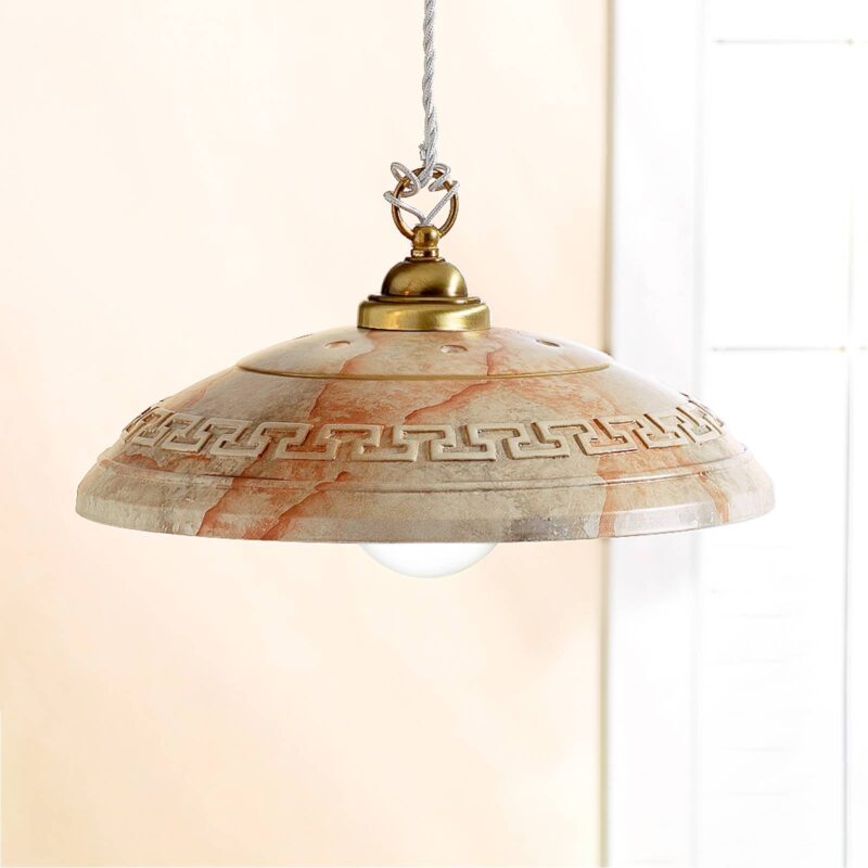 GRECA MARMO grécka závesná lampaVýrazný dizajn závesnej lampy pripomína grécky mramor. Závity v béžovej a mosadznej farbe zdobia kvalitné tienidlo z keramiky. Aplikácia na okraji tienidla inšpirovaná gréckymi motívmi a rozeta v mosadznej farbe dotvárajú stredomorský nádych.jedinečná dekorácia v každej miestnostizávesná lampaUmelecky spracovaná lampa dokáže v krátkej verzii dokonale osvetliť kuchyňu alebo obývacie izby a pomocou dlhého 110 cm závesu aj jedálenský stôl. tienidlo s priemerom 37 cm a 100-wattová žiarovka poskytujú teplé, jemné svetlo a príjemnú atmosféru v klasicky zariadených miestnostiach.