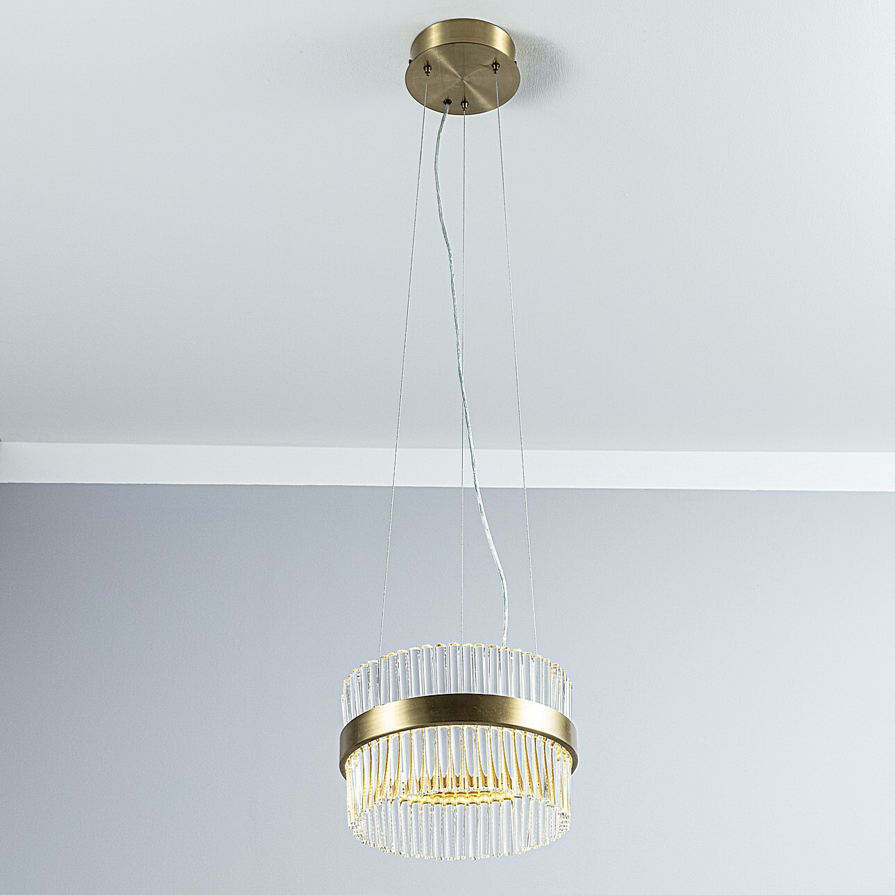 Mimoriadne elegantná a štýlová závesná lampa z kovu a skla.Kovový okraj má zlatú farbu so saténovým povrchom. Osvetlenie LED je integrované do kovového ráfika.Celá lampa je namontovaná na zlatom (saténovom) strope.Okrúhly tvar lampy, kombinácia zlatej farby a sklenených prvkov zabezpečujú optimálne osvetlenie miestnosti.Dokonale zvýrazňuje usporiadanie v glamour štýle, ale aj moderné a klasické. Vizuálne osvetľuje miestnosť a dodáva jej pôvab a eleganciu.Rozmery: priemer 30 cm, max. výška 132 cm.