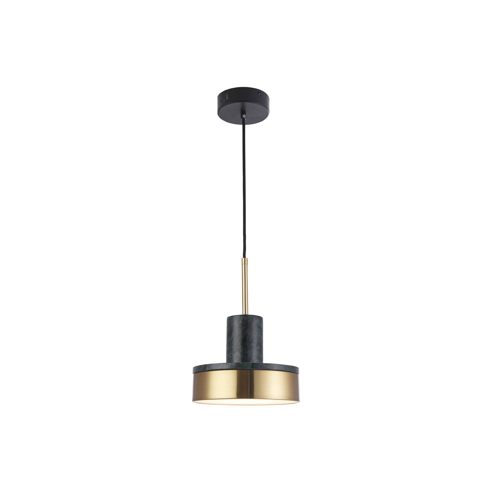 Závesné svietidlo Lithos LED s mramorovým závesom Závesné svietidlo Lithos LED je absolútne pútavé vďaka výberu materiálov a kontrastným farbám: tienidlo je vyrobené z lakovanej ocele zlatej farby a záves je z kontrastného farebného mramoru. Lithos je ideálnou voľbou pre každého, kto hľadá energeticky úsporné riešenie osvetlenia. Vďaka integrovanému svetelnému zdroju LED poskytuje príjemné a jasné svetlo, ktoré premení každú miestnosť na inšpiratívnu atmosféru. Či už v obývačke, jedálni alebo kuchyni – Lithos je všestranný a dokonale sa prispôsobí akémukoľvek štýlu interiéru.