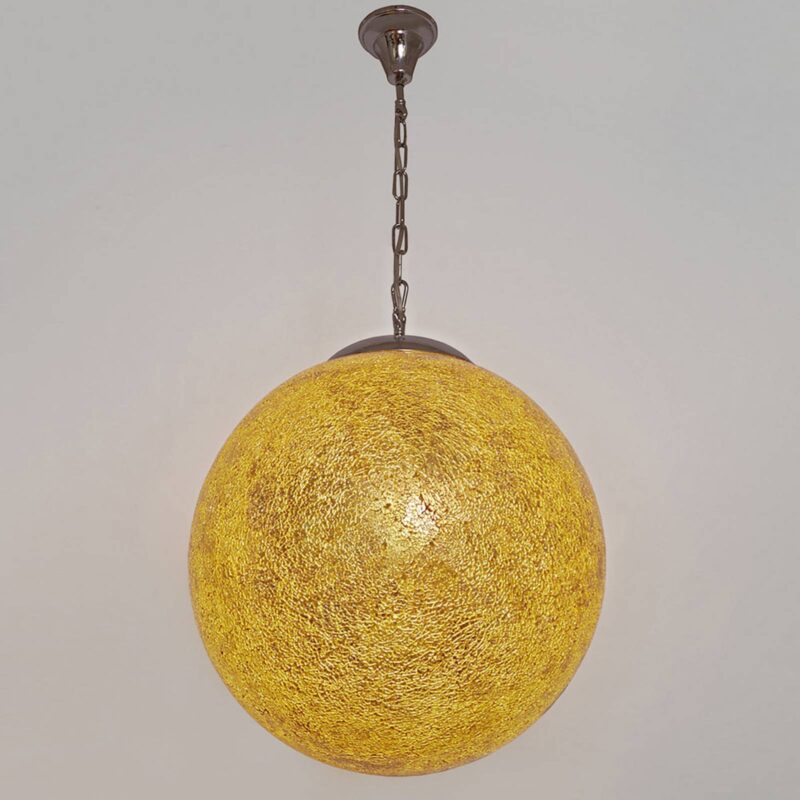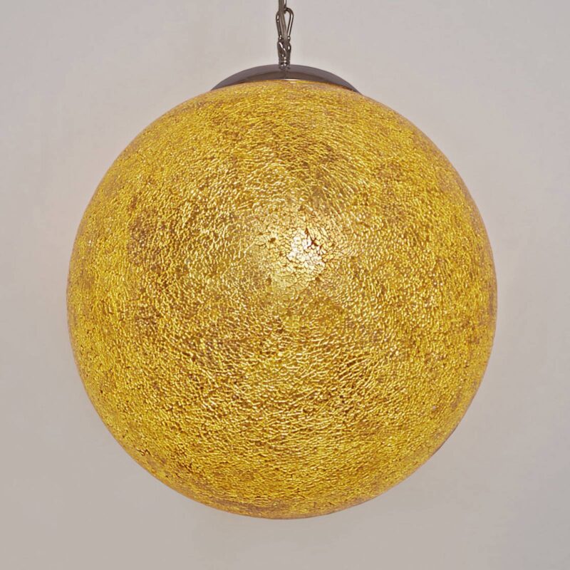 Závesné svietidlo Narziso so sférickým tienidlo na lampu vyrobené zo skla – jantárovej farby Filigránová mozaika z jantárovo sfarbeného skla vyústi do sférického tienidlo na lampu závesnej lampy Narziso, ktorá je pripevnená k pochrómovanému vrchlíku pochrómovanou závesnou reťazou. Svetlo použitého osvetľovača nastavuje dekoratívnu štruktúru mozaiky v centre pozornosti. Teplé, jemné svetlo je vyžarované po celej miestnosti. Ideálne ako všeobecné osvetlenie alebo na osvetlenie jedálenského stola. Výška zavesenia sa môže počas inštalácie meniť raz medzi 70 cm a 145 cm. – stmievateľné (externé)