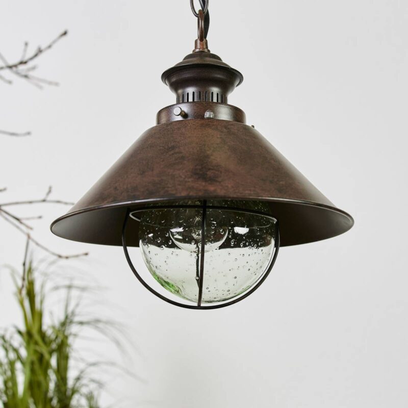 Rustikálna vonkajšia závesná lampa Nautica Toto štýlové stropné svietidlo vyrobené zo železa v hnedej oxidovanej farbe a s antickým vzhľadom ozdobí každú záhradu svojím príjemným dizajnom. Dva pretínajúce sa dekoratívne oblúky nad sklom doplnkovo oživujú rustikálny vzhľad. Svietidlo patrí do série svietidiel pôvabného štýlu, ktorá je ručne vyrábaná a zapôsobí na vás svojím dekoratívnym dizajnom a svojím útulným svetlom.