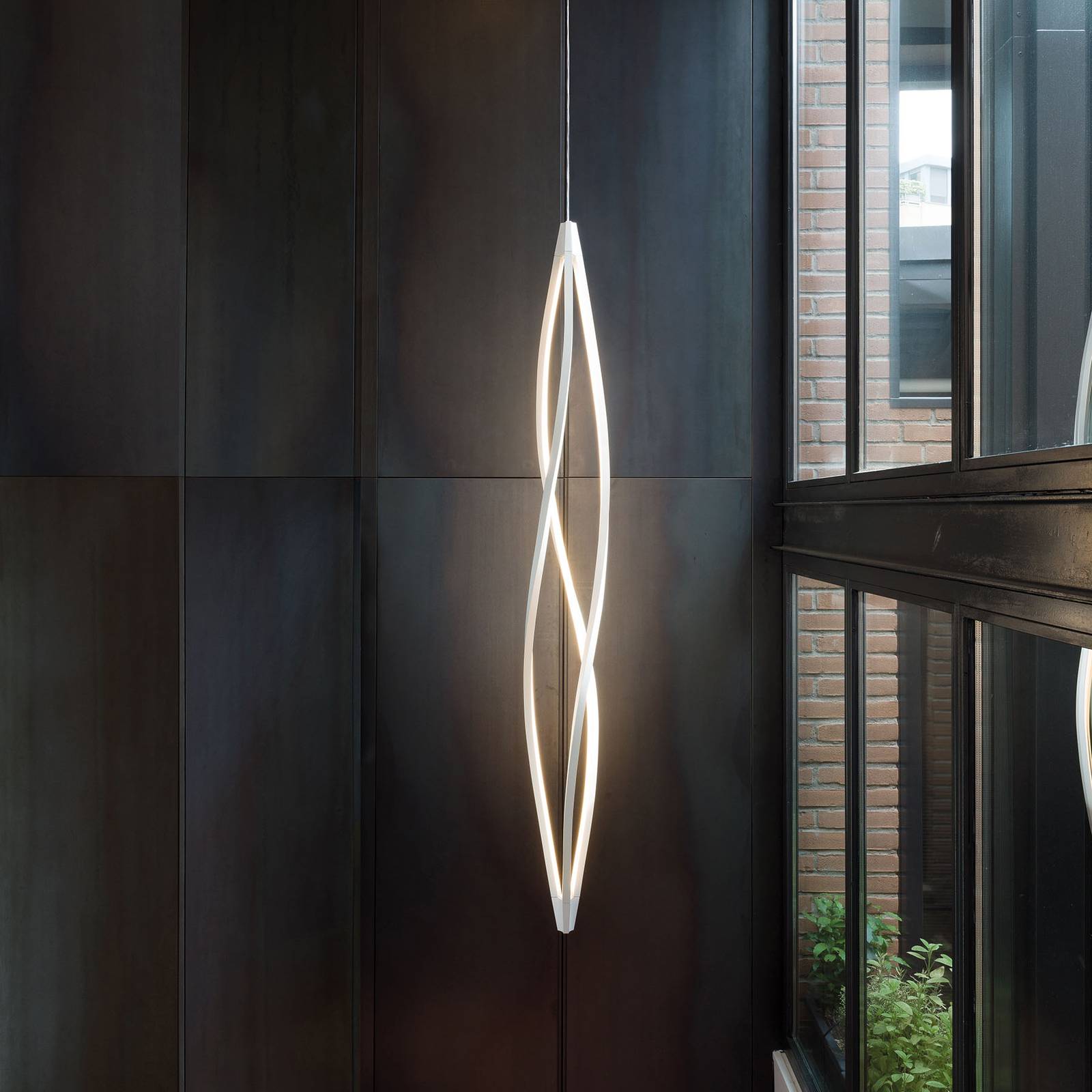 Závesné svietidlo LED In The Wind – vertikálna konštrukcia z krútených profilov Moderný zdroj svetla, ktorý upúta pozornosť hneď po vstupe do miestnosti – závesné svietidlo In The Wind je pôsobivým, výrazným a zároveň harmonickým prvkom interiérového dizajnu. Konštrukcia od Arihiro Miyakeho sa skladá z troch vertikálnych hliníkových profilov, ktoré sú navzájom mierne stočené a zakončené spoločným horným a dolným koncom. Na vnútornej strane vzpier sú integrované súvislé pásy teplých bielych LED diód. Ich svetelný výkon možno ovládať pomocou externých stmievačov DALI. Vzhľadom na dĺžku kábla 3 m (počas inštalácie sa dá skrátiť) je svietidlo In The Wind vhodné aj na použitie vo vysokých, prestížnych miestnostiach.