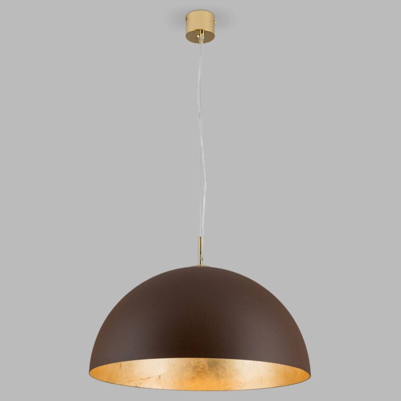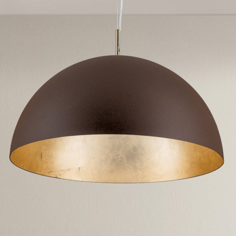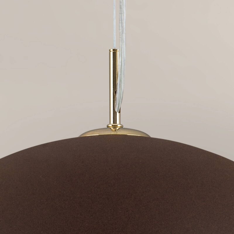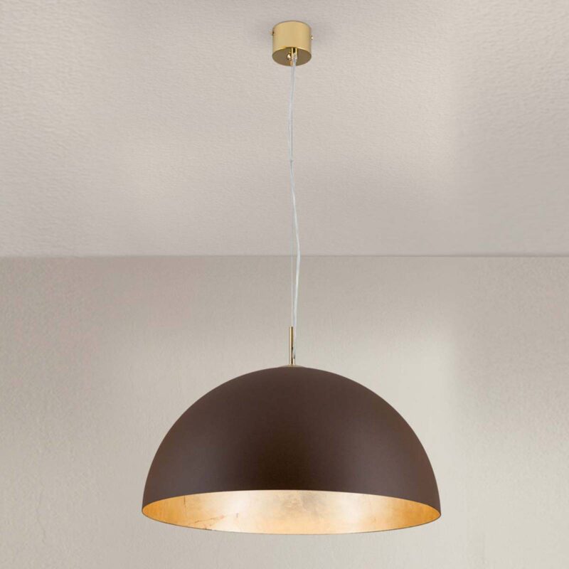 Pozlátená vnútorná strana so vznešeným leskom: Závesné svietidlo Nerry Polguľové tienidlo závesnej lampy Nerry má na vonkajšej strane matný hnedý povrch a vo vnútri je vykladané fóliovým zlatom. Táto zlatá vnútorná strana dodáva svietidlu v zapnutom stave dodatočný lesk a výnimočnú svietivosť. Zavesenie je pozlátené 24-karátovým zlatom. Jednoduchý tvar a výnimočné vybavenie a k tomu ešte aj extravagancia – závesné svietidlo Nerry vás presvedčí mnohými funkciami a v neposlednom rade tým, že bolo ručne zhotovené v Taliansku, a preto je prísľubom jedinečnosti a dlhej životnosti.