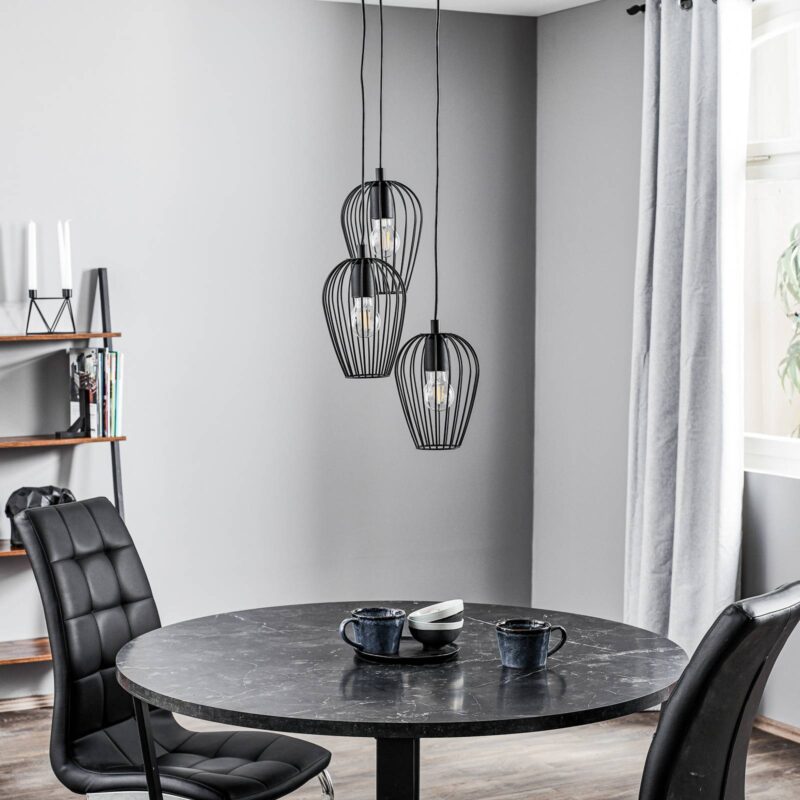 Okrúhle závesné svietidlo Newtown s tromi tienidlami z kovových priečok Závesné svietidlo Newtown vnesie do vašej obývačky nádych vintage štýlu. Čierne svietidlo je vyrobená z ocele a skladá sa z okrúhlej stropnej konzoly, z ktorej visia v rôznej výške tri tienidlá. Tieto sa skladajú z jednotlivých kovových priečok, ktoré boli vytvarované do kalicha, vďaka čomu je výhľad na žiarovky úplne voľný. Preto odporúčame použitie dekoratívnych filamentových žiaroviek (nie sú súčasťou dodávky).