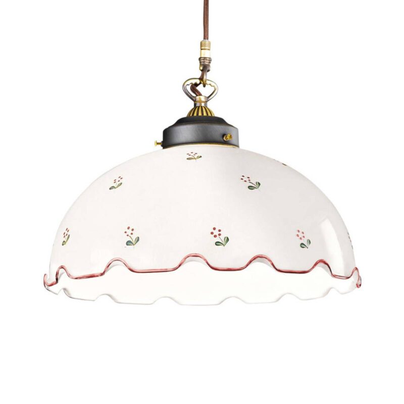 Závesné svietidlo Nonna s tienidlo na lampu vyrobené z ručne fúkaného skla s atraktívnym riaseným okrajom Závesná lampa Nonna Scattered Flower sa prezentuje v rustikálnom vidieckom štýle a stáva sa spoločníčkou nad jedálenským a kuchynským stolom. Jeho tienidlo na lampu je vyrobený z ručne fúkaného skla a je zdobený malými maľovanými kvetmi v jemnej ružovej farbe. Koniec dáždnika tvorí veľká volánová hrana. Odpruženie Nonna je vyrobené zo starých mosadzných kovových prvkov, ktoré žiarovke dodávajú rustikálny šarm.