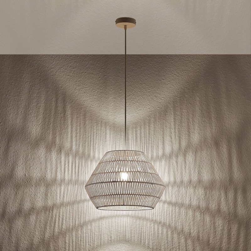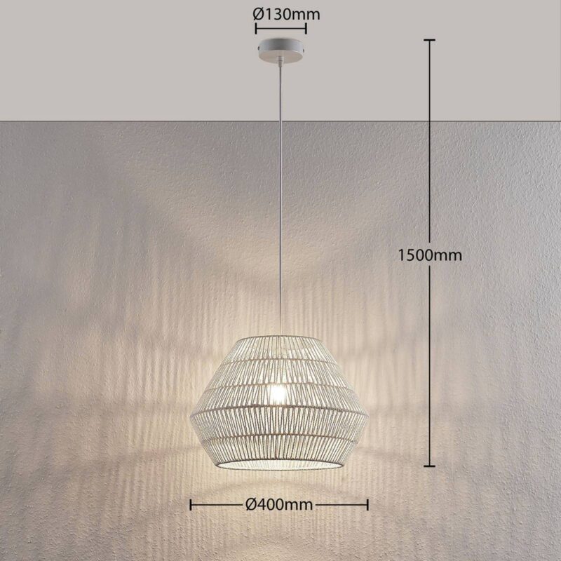 Vypletaná závesná lampa Ottavio s napnutými papierovými kordelmi v bielom Závesná lampa Ottavio sa rozširuje zhora smerom dole a nakoniec sa mierne zužuje. Tienidlo nie je z látky, ale z elegantného výpletu z papierového kordelu, ktorým efektne preniká svetlo, takže ponúka efektné osvetlenie, ktoré vyzýva oddych. Závesná lampa sa hodí rovnako dobre na osvetlenie stola, ako aj na príjemné presvetlenie spálne.