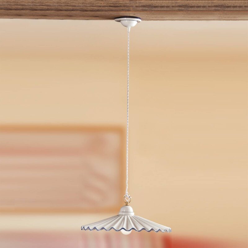 Závesné svietidlo PIEGHE z keramikyPIEGHE je to pravé závesné svietidlo, ktoré v kuchyni alebo jedálni dokonale dotvorí vidiecky štýl. Ploché keramické tienidlo so štruktúrou vlny je peknou ozdobou a väčšinu svetla smeruje nadol na stôl. Pekným detailom je farebný okraj tienidla.