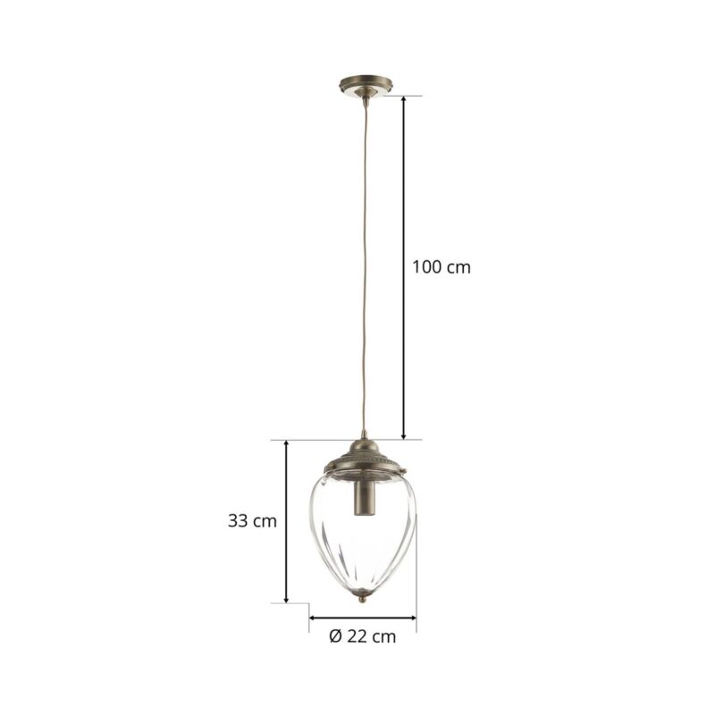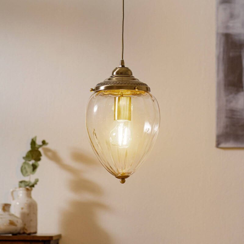 Sklenená závesná lampa Ananás s orientálnym nádychom Žiarovka ako ananás, tvaru slzy a vybavená vlnitou štruktúrou, tienidlo na lampu príveskového svietidla Pineapple vyzerá iba v dizajnovom jazyku. Dopĺňajú to zdobené kovové prvky, ktoré sú vyrobené zo starožitnej mosadze. Výsledkom súboru je úžasne dekoratívna lampa, ktorá prináša príjemné a útulné svetlo do všetkých obytných priestorov, či už do spálne, obývacej izby alebo kuchyne.