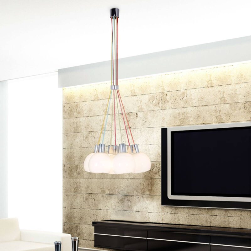 Svieža závesná lampa Rainbow Bowl s bielym tienidlomZávesná lampa Rainbow Bowl má svieži, ležérny dizajn. Jej sedem bielych sklenených tienidiel poskytuje silné svetlo, keď sa vhodne zvolí žiarovka E14. Farebné káble slúžia ako držiak a prívodné vedenie. Na podperu, krúžok zväzku a objímku sa používa lesklý kov. Živý vzhľad závesnej lampy Rainbow Bowl prispieva k atmosfére živých a moderných obývacích izieb a jedální.